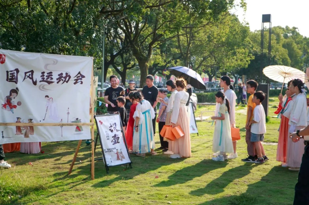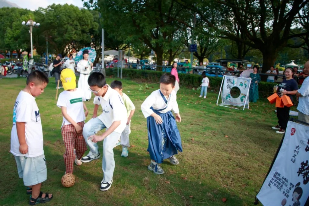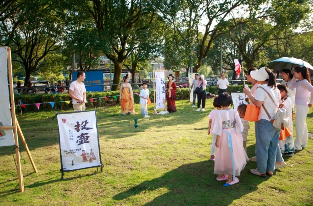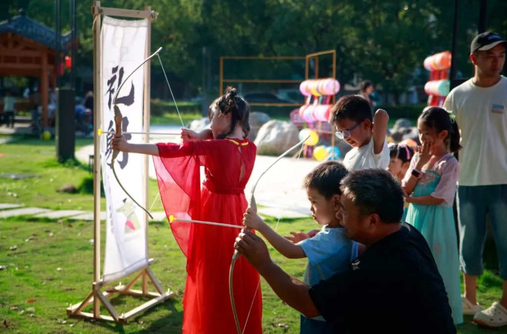 与此同时,“双节同庆·红韵国风”中秋汉服巡游游园会的国风运动会也热闹开场,不少汉服爱好者自发参与其中,沉浸式体验传统竞技项目和非遗民俗文化。投壶区内箭矢轻掷,划出优雅弧线;蹴鞠场上巧传妙接,激起阵阵欢声;捶丸区,木槌击球声声脆响;礼射场中喝彩不断,热闹非凡。