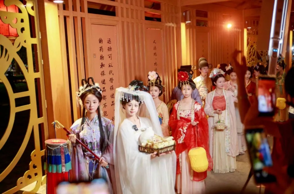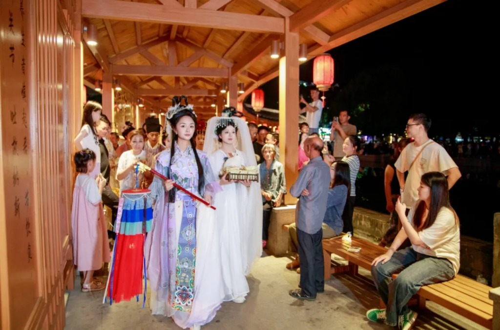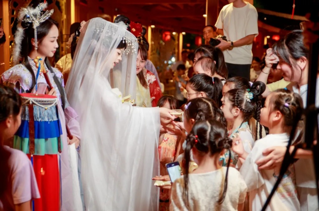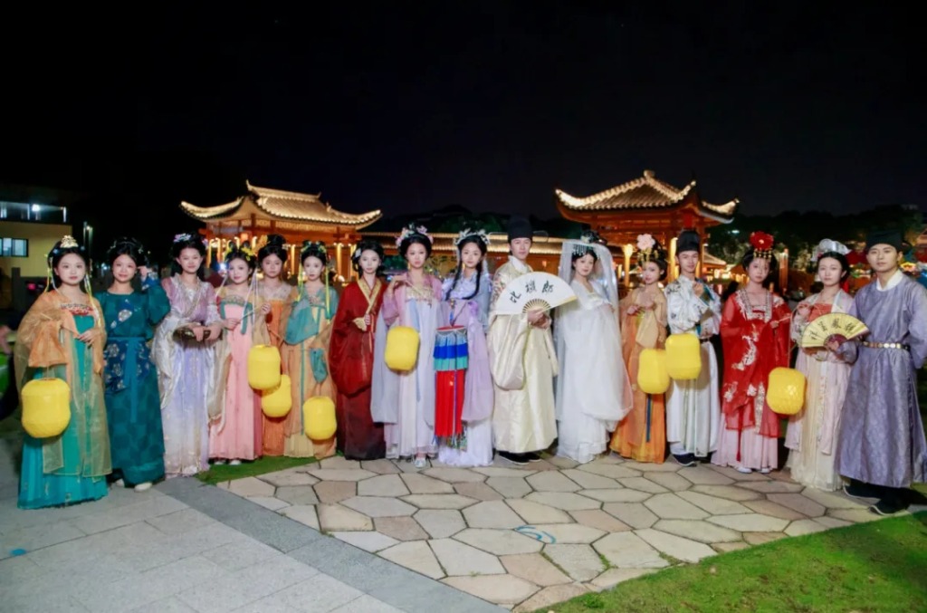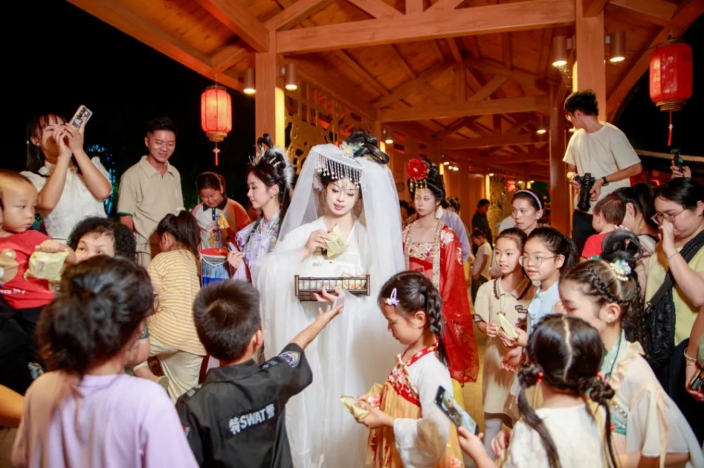 夜幕降临,皓月当空。中秋汉服巡游开始,汉服模特沿湖心亭、月亮桥缓缓行进,衣袂飘飘,造型典雅,与夜灯湖影交织成一幅流动的国风画卷。沿途游客纷纷举起手机拍摄,模特们不时停下与观众互动合影,并送上定制月饼小样,亲手传递中秋祝福。