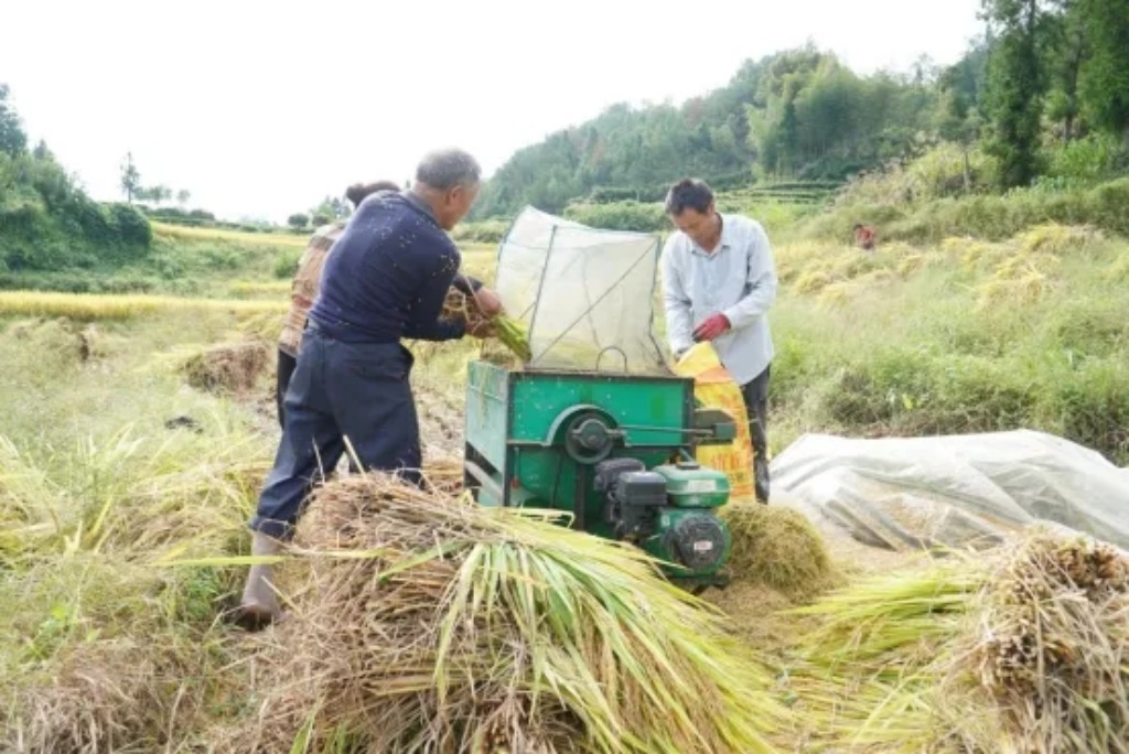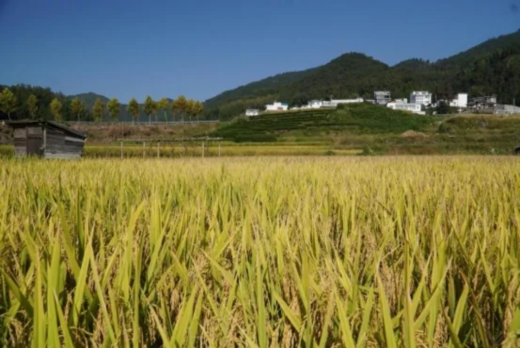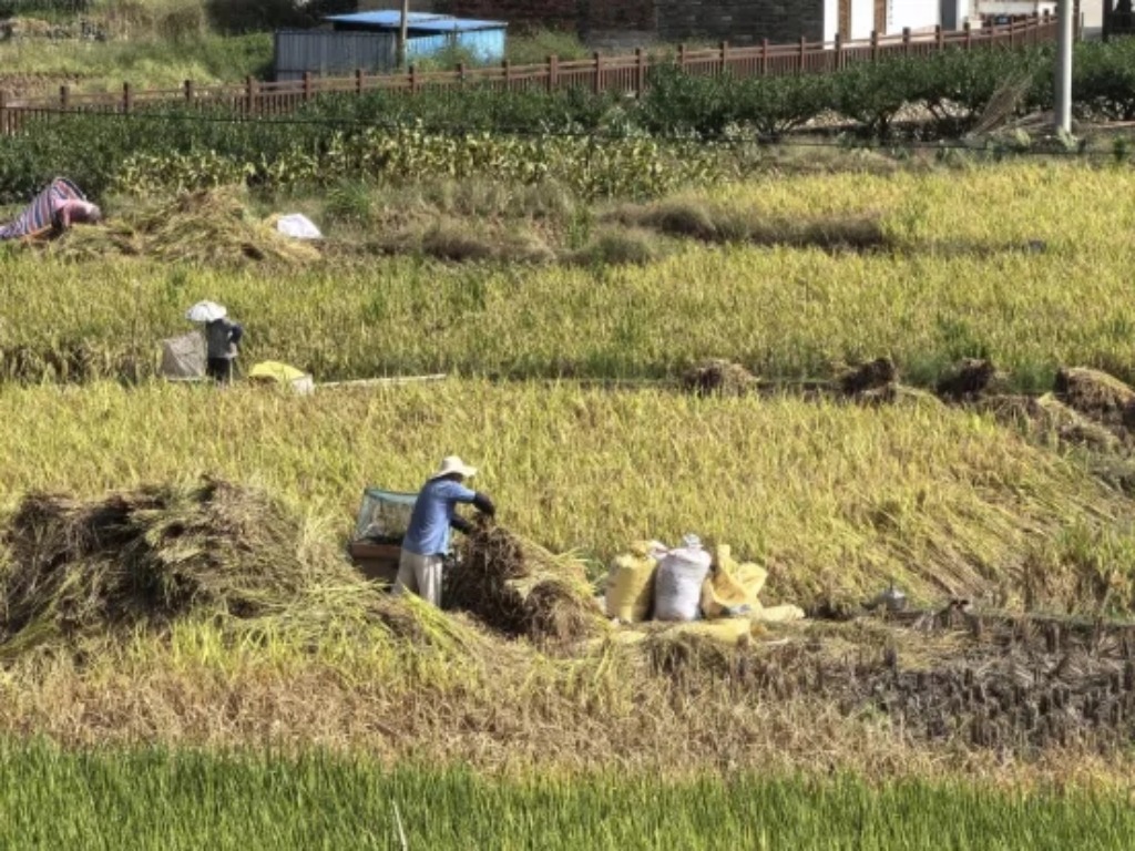 一片片成熟的水稻泛着金黄,沉甸甸、密实实的稻穗已将稻秆压弯。村民们手中镰刀飞舞,熟练地收割着一茬又一茬的稻谷。