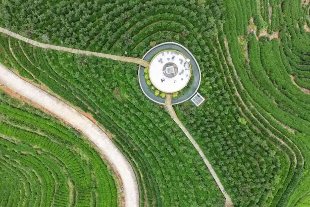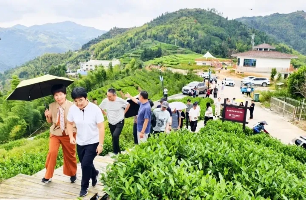 午后的茶香在山间流淌,采风团走进了富溪镇岭后村。这座海拔680米的高山村落,静守着一片茶园。梯田式的茶园依山叠翠,如同大地的绿色诗行。露珠点缀着新发的嫩芽,微风过处,满园清香。采风团穿行于茶垄之间,近距离感受这片土地孕育的茶文化;无人机缓缓升起,将连绵的茶山与远方的村落收入画面——绿浪接天,层叠如织,勾勒出一幅产业兴、生态美的乡村画卷。