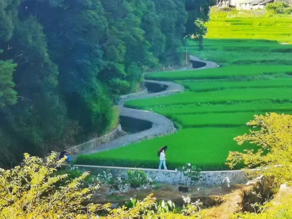 漫步吴洋,石径苔痕幽深,千年驿道蜿蜒于翠峦之间。在吴洋村庄的入口,古油坊的香气飘散四野,但我就被那片稻田“治愈”着。所谓“叠翠胜黄金”便是吴洋稻田的意蕴。眼前层层叠叠的田垄,如锦缎铺展,尽染金黄,左立风车水转,右展樱花栈道,周遭被翠林环绕,想必非独仲夏之盛景:春日绿苗如茵,秋日稻浪金黄,四季轮转间,小小吴洋演绎着生命的循环。伫立观云台,目睹金黄稻田与远山相映成画,时光仿佛在此刻静止,红尘之扰远去。
