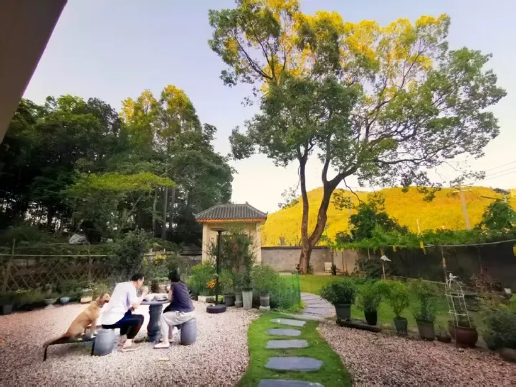 我们到的时候,已是正午。山里夏末的风是凉的,所以,友人的家人敢于围坐在庭院的小石桌上吃午饭。阳光透过老樟树洒下斑驳光影,石桌上摆满家常菜肴,氛围温馨宁静。友人的小舅子手一挥,那只正人来疯的黄狗,立即乖巧地席地而坐,目光温和地望向主人,尾巴轻摆。友人说,这只黄狗原是流浪狗。年前,他们把这栋老屋重新修缮后,便住了下来。没想到,几只流浪狗也尾随而至。最后,他们挑了这只精灵的黄狗,也一并住了下来。这只黄狗也懂得感恩,除了陪伴、守护主人的家,它还学会了一项技能,那便是捡拾垃圾。