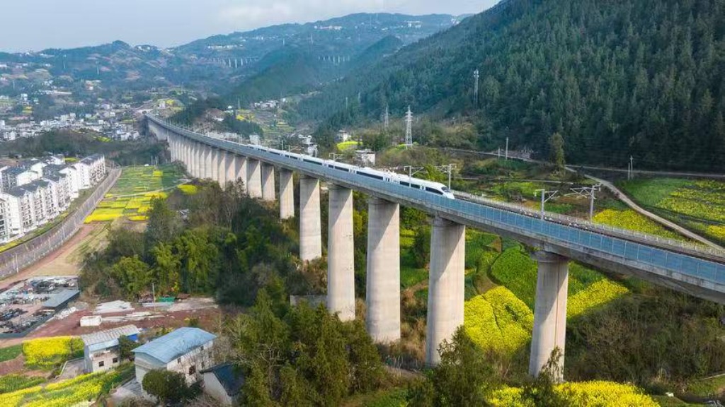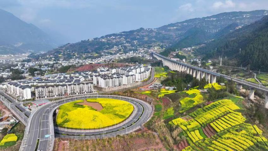 走进平阳坝,就像走进了一幅画。最吸引人的,是动车从花海和田间穿过的场景。高铁线路外的环形公路里,油菜花田像一块巨大的金色地毯铺展开来,各种颜色的动车组疾驰而过,像极了流动的花海,满眼都是春的景色。