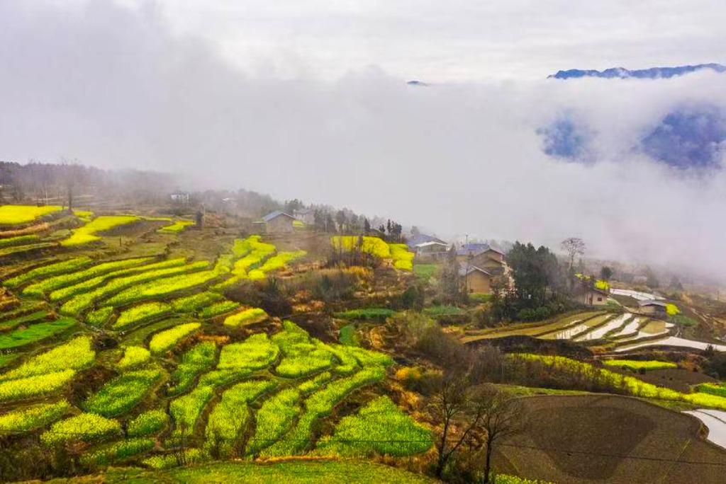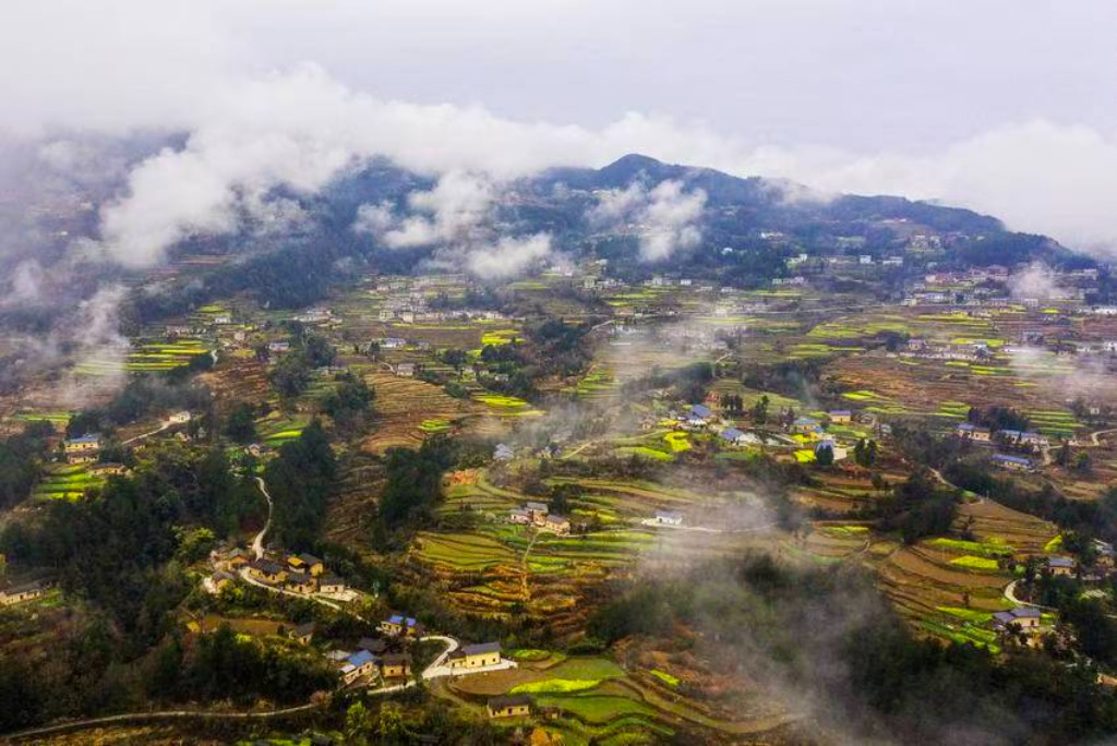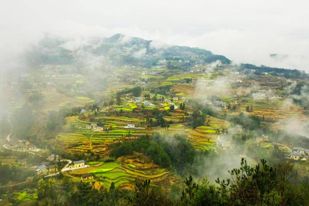 牛洞坪村的土屋梯田版图,是绝无仅有的少数民族风格,是勾起人们不忘初心、浓浓乡愁的润滑剂。春末夏初,田地里、山坡上桃花、李花、樱桃花和油菜花次第开放,繁华似锦,加上时晴时雨云雾缭绕,与层层梯田、口口塘堰、幢幢土屋、袅袅炊烟共同演绎出三峡大地的风景大片。
