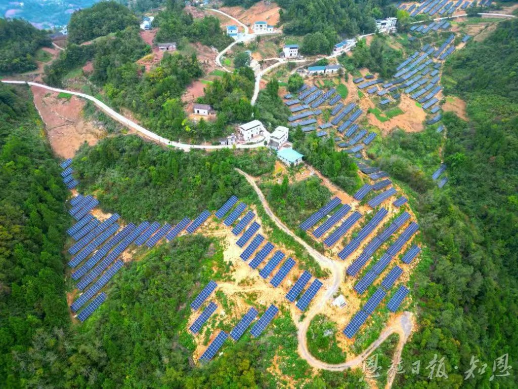 (俯瞰100MW农光互补沿神光伏发电站,青山绿水环绕,恍如一座“光电银行”)