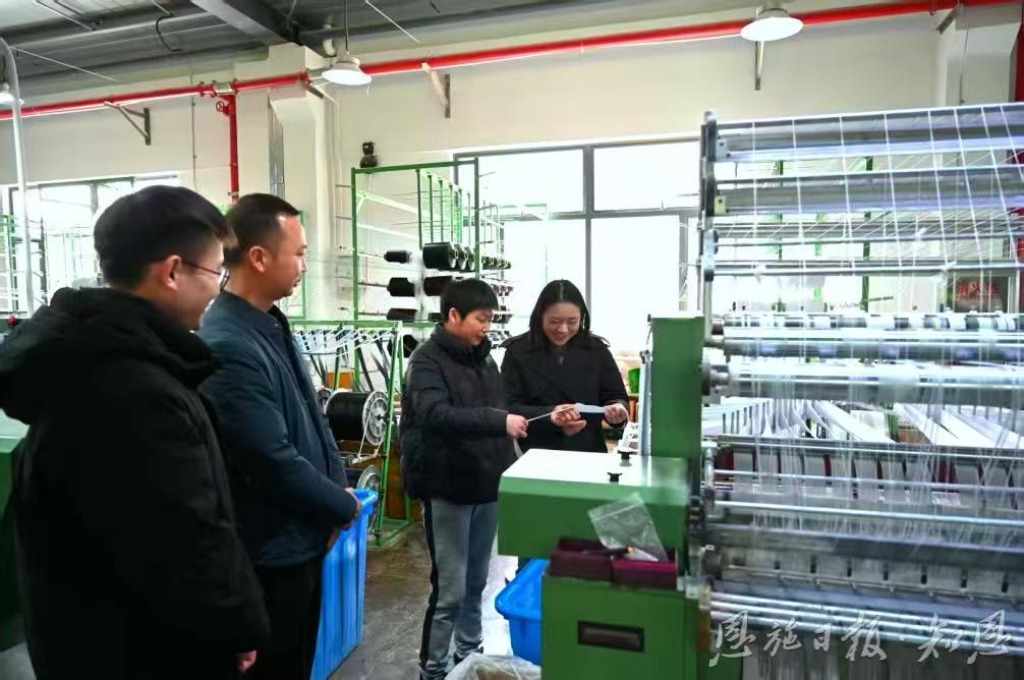 (在湖北溢锦纺织有限公司生产车间,镇干部正在了解企业生产情况)