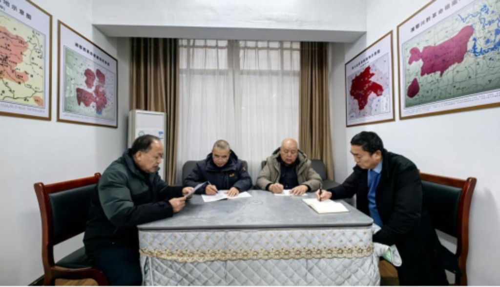▲左起:王仕高、钱名冬、黎兴国、赵明金在会议室集中学习、交流发言。
