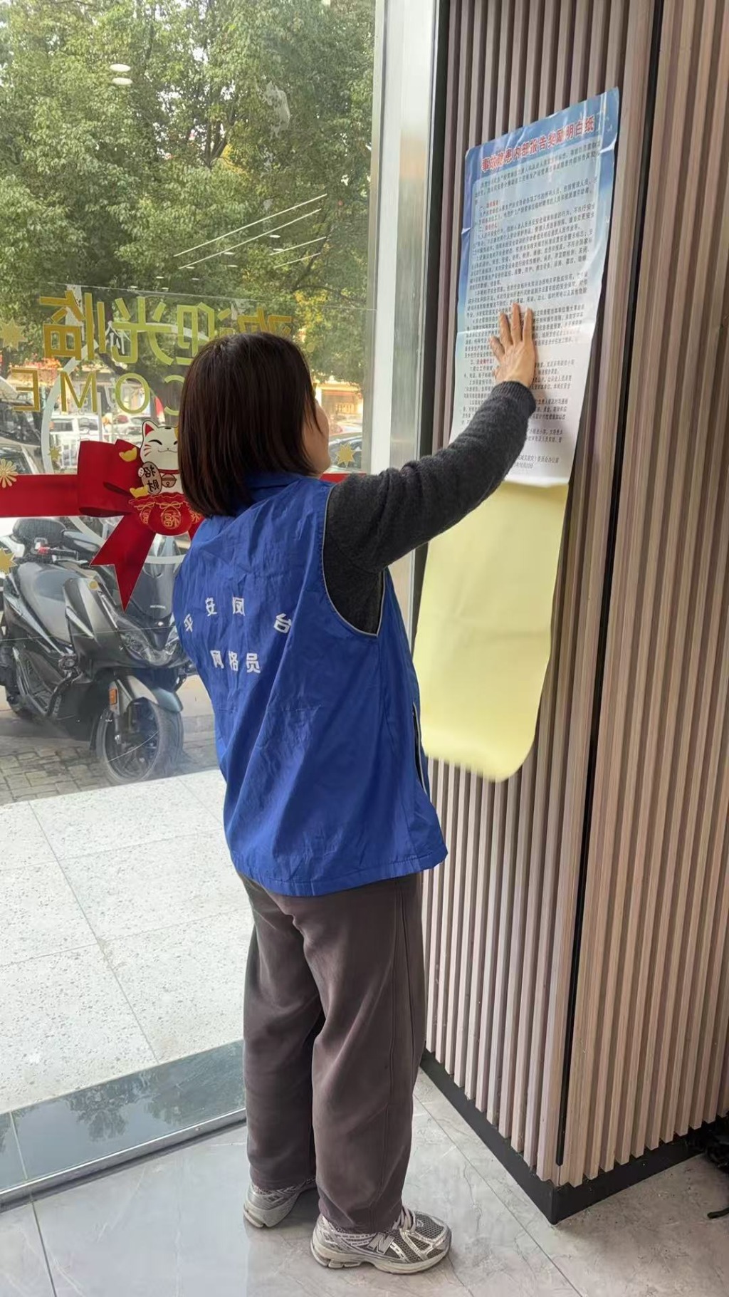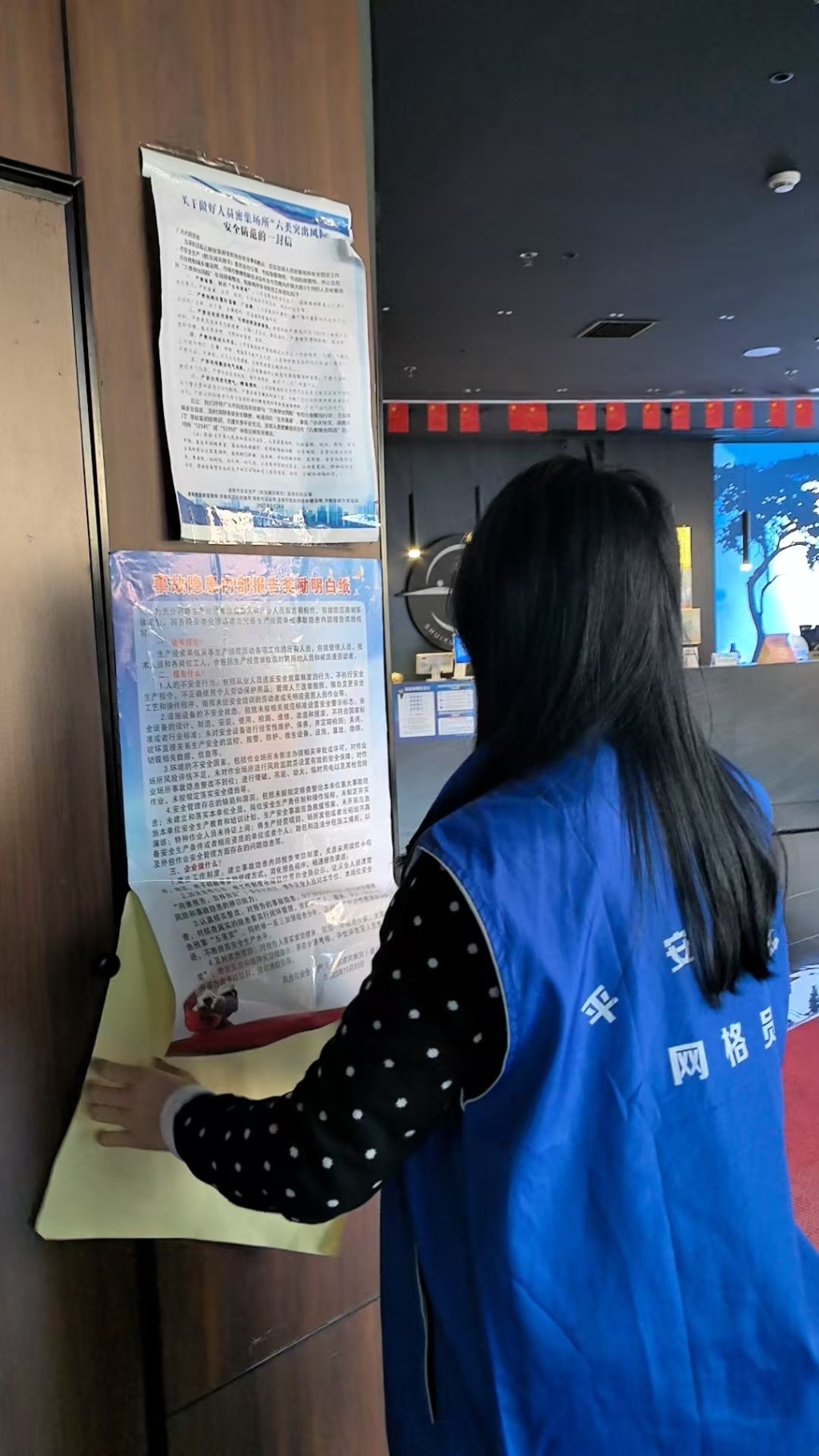 在滨河湾南区一小区内,社区网格信息员在张贴宣传海报的同时,还向过往的群众介绍了事故隐患内部报告奖励明白纸有关内容,如谁来报告、报告什么、企业在做什么等,让过往的群众及时了解整个海报中的有关内容。