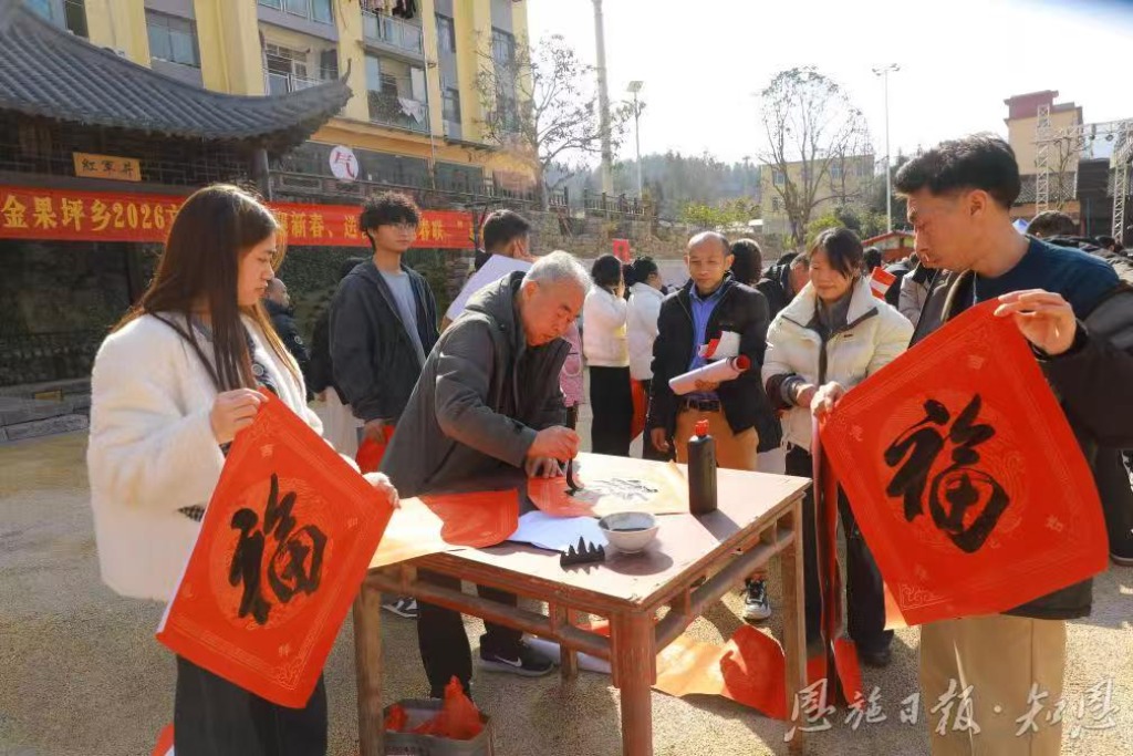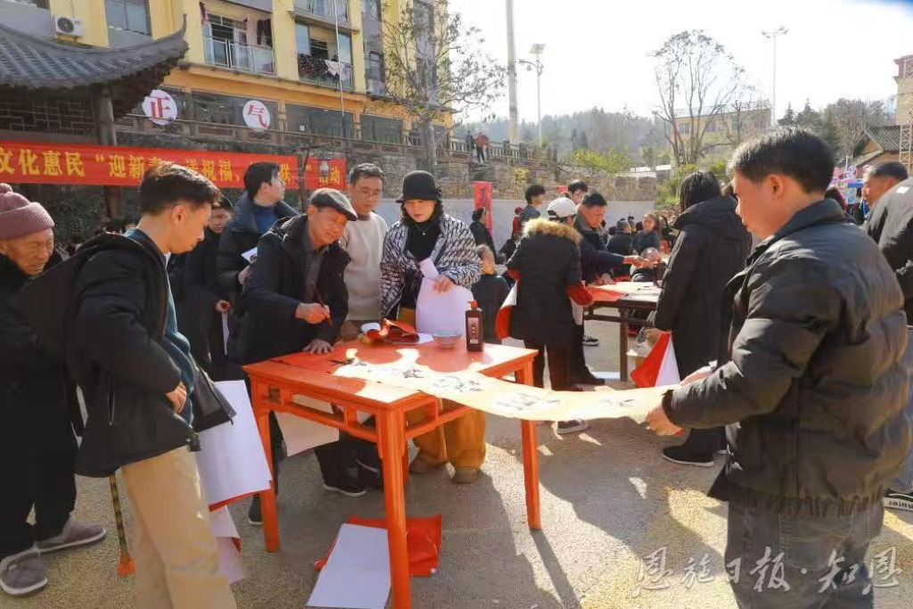 当天,是农历小年,为营造欢乐祥和、喜庆热烈的新春氛围,该乡在红军广场举行2026年“迎新春、送祝福、赠春联”活动,邀请辖区业余书法爱好者义务为村民写福字、写春联。