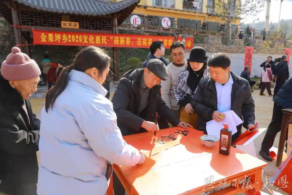 2026年2月11日,在老革命根据地湖北省巴东县金果坪乡红军广场,书法爱好者正在凝神运笔、挥毫泼墨为群众送上饱含祝福的新春对联和一个个福字。