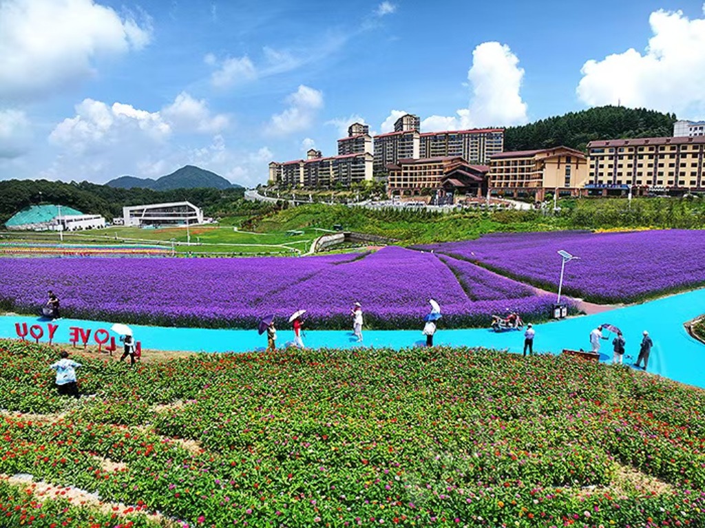 (夏日,绿葱坡滑雪场是一片花海,吸引众多游客前来拍照打卡)