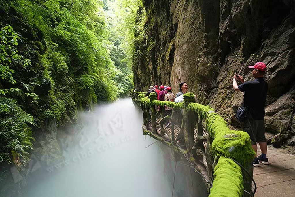 (在巴人河景区,游客穿行在峡谷间,尽享清凉一夏)