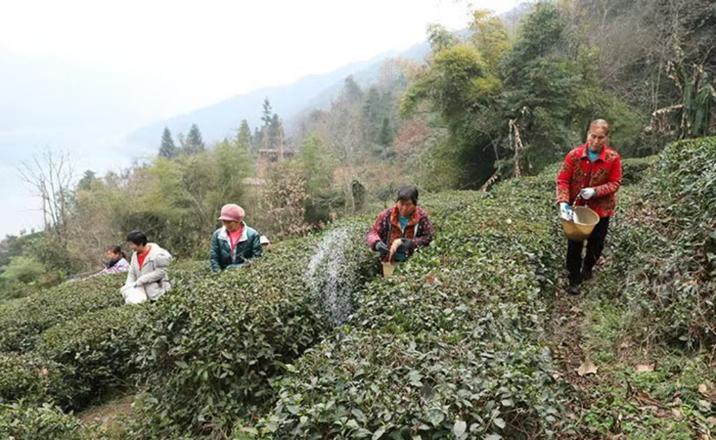 2026年2月28日,巫峡深山老革命根据地湖北省巴东县金果坪乡江家村,茶叶托管员在吴家岭茶园追施有机肥。