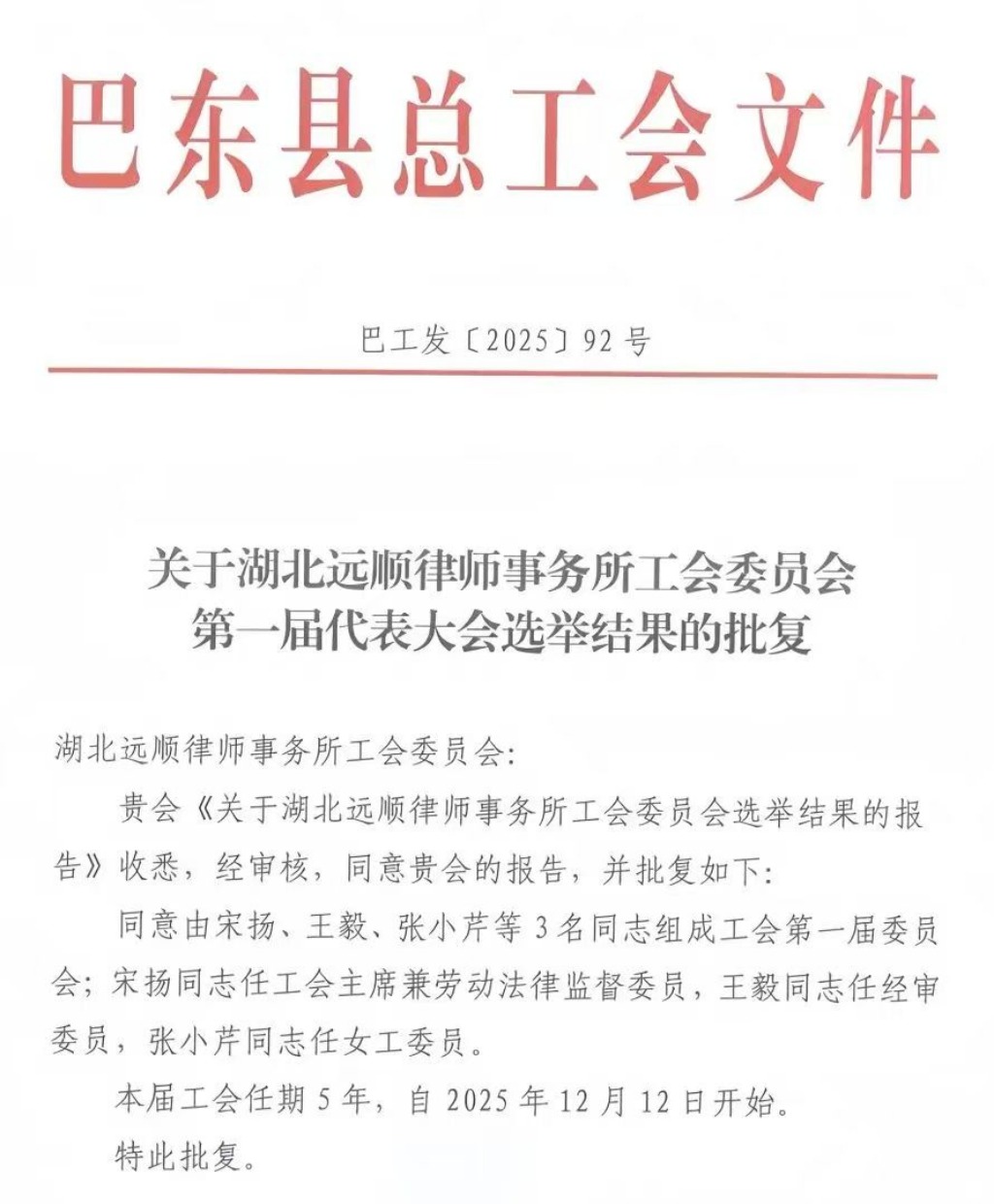 此次工会的成立,标志着湖北远顺律师事务所职工权益保障与民主管理工作迈入新阶段。未来,工会将通过制度化、规范化的运作,进一步增强团队凝聚力与职工归属感,为律所的持续健康发展与社会和谐稳定注入新动力。