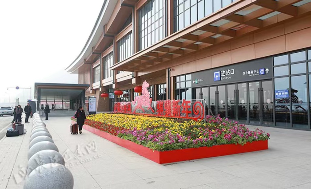 (巴东高铁站,旅客从新装扮的花坛前走过)