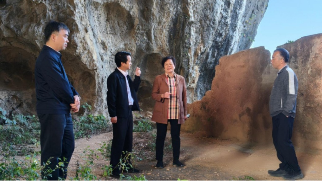 县委张书记在穿镜岩革命遗址调研指导。重温革命历史,缅怀革命先烈。1939年12月18日蔡延锴调任二十六集团军总司令率部进灵山,当天司令部驻进马鞍山岩洞内,后来又从马鞍山迁至六峰山、三海岩、穿镜岩一带。在指挥泗峡坳三天三夜的激烈战斗中,取得了辉煌战绩,击毙日军第十八师团中队队长吉田三郎及下属340多人,我抗日军民牺牲280多人,是灵山县抗目史上一次最大最惨烈的战斗。激战三昼夜,重创日军,挫败其增援昆仑关的图谋。研究部署遗址保护修缮与红色文旅融合发展工作。认真听取黄会长汇报遗址历史沿革、保护现状及近年来修缮工作情况,详细询问遗址周边环境整治、配套设施建设、红色故事挖掘等方面存在的问题与困难。