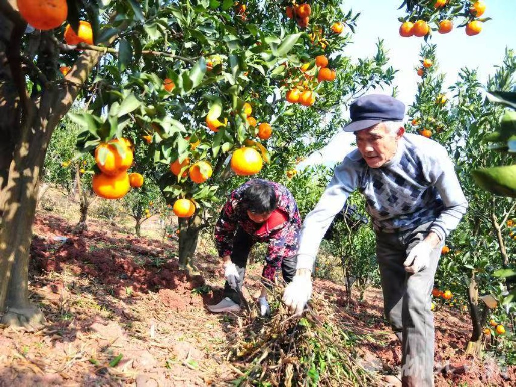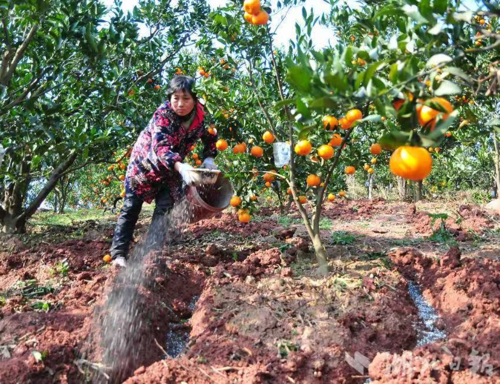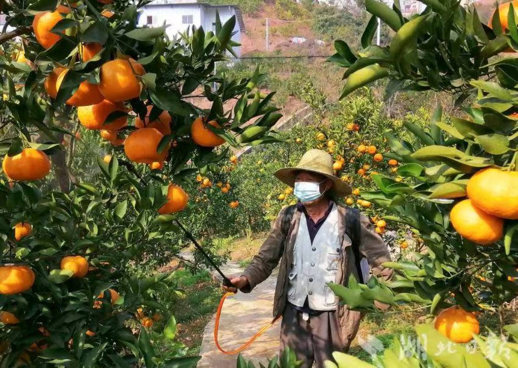 2025年12月24日,巫峡深山湖北省巴东县官渡口镇五里堆社区二组果农李胜龙在打防冻的药水,预防冰冻灾害可能带来的损失。他家请的小工也在忙着给果树施肥、锄草,硕大金黄的果子诉说着丰收的喜悦。
