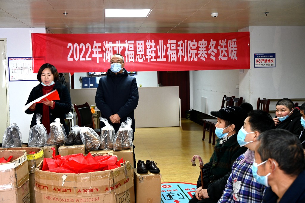 在湖北恩施,说起福恩鞋业人们并不陌生,近年来,福恩鞋业负责人崔金莲带着爱心团队,“踏雪”到海拔1500米的官店镇金家湾村送100双爱心鞋业,到业州镇寨坡村抗洪救灾,为贫困群众送鞋180余双,赴海拔1300余米茅田乡朱家包村爱心帮扶, 160余留守老人、留守妇女穿上“福恩鞋”:为“万企兴万村”结对帮扶的红岩村,累计4次为贫困群众送鞋300余双;先后为县福利院,红岩寺镇福利院民送“暖心”鞋480余双;为红岩寺小学,落水洞小学,高坪镇望坪小学等留守儿童送“爱心鞋”1290余双.2024年将234双“福恩娃”品牌鞋支持建始县首届残疾人运动会的运动健儿。截止目前,福恩鞋业累计捐赠各式爱心鞋业3000余双。