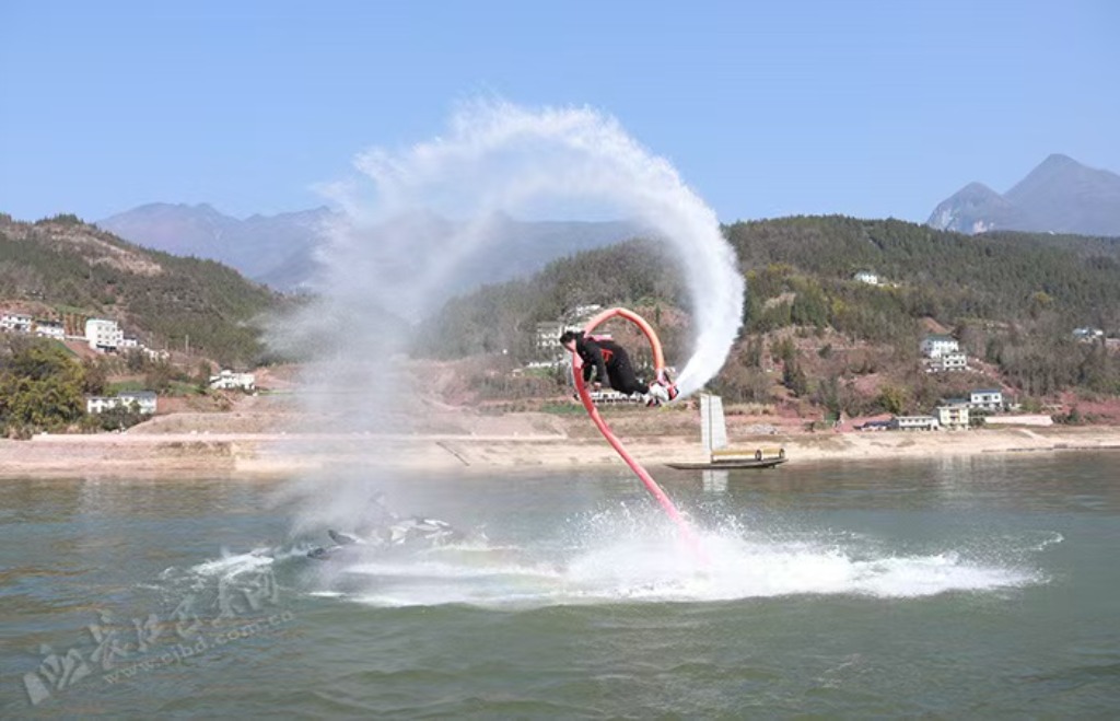 在波光粼粼的湖面上,一道矫健的身影腾空而起,宛如一只振翅腾飞的白鹭。伴随着轰鸣声,水花四溅,映出一道道绚丽彩虹,煞是好看。腾空翻转、飞人踏浪惊险刺激,专业人员表演的水上飞人吸引着无数游客驻足观看。这项极具观赏性的活动,不仅展现了人类对自然力量的巧妙运用,还为游客带来了一场视觉与心灵的双重盛宴。