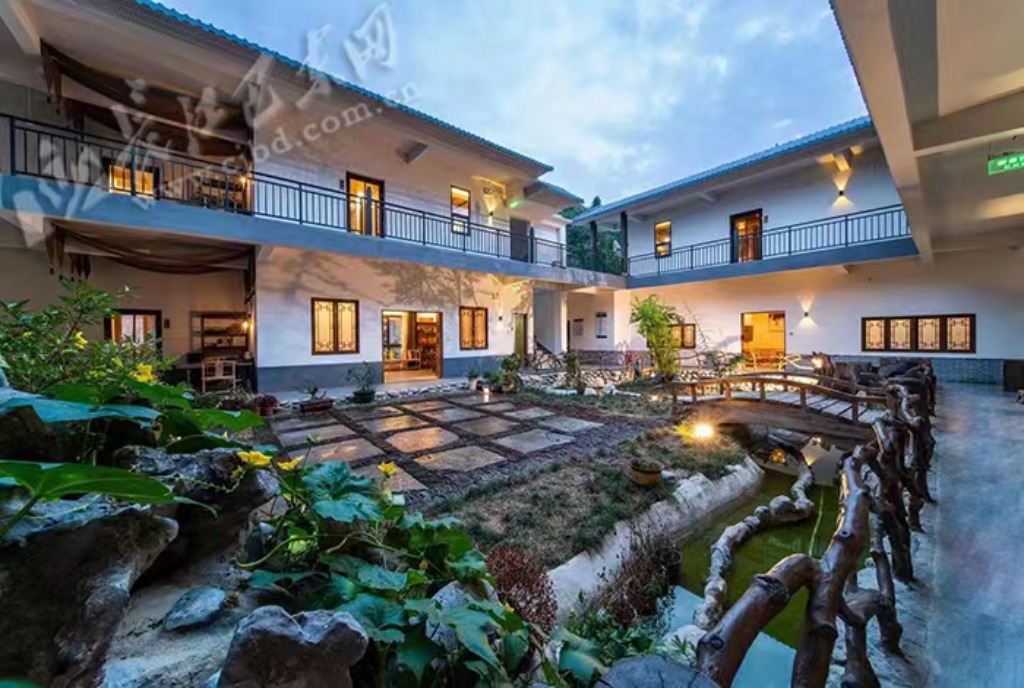 梦园民宿是一栋两层的四合院式建筑。天井里铺满石板与旧瓦,微型拱桥与小水塘构成“小桥流水人家”的景致,四周摆放的盆景与之交相辉映,格外雅致。