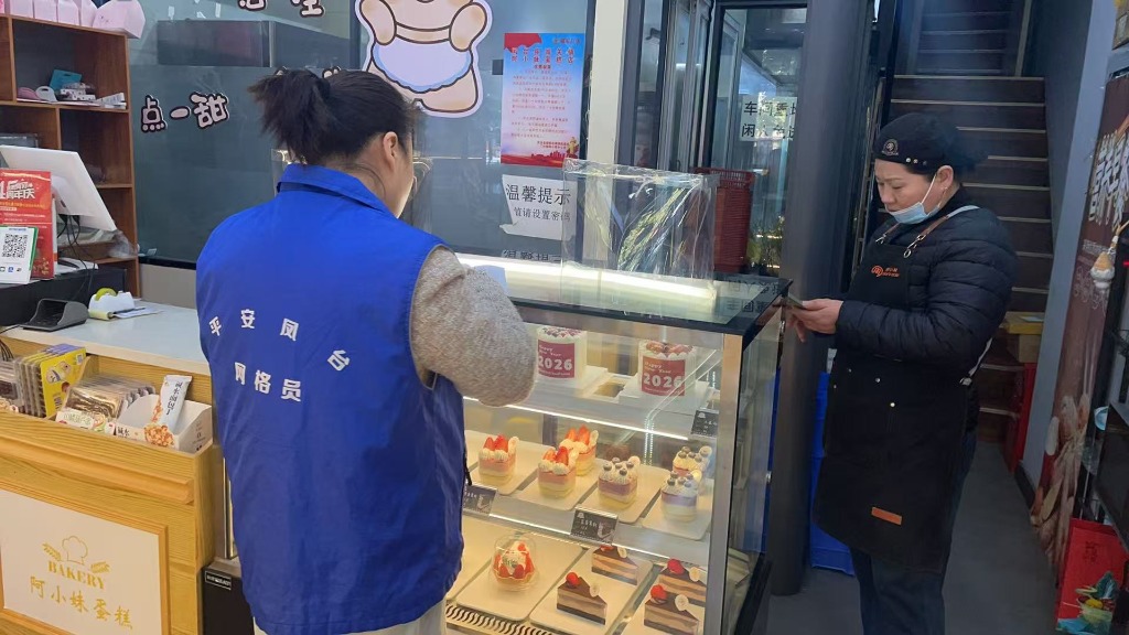在一家店铺里,社区安全管理工作人员查看了各个角落,是否出现用电线路老化、是否堆放易燃物品、消防器材是否能够正常使用,以及店员能否会使用灭火器等。