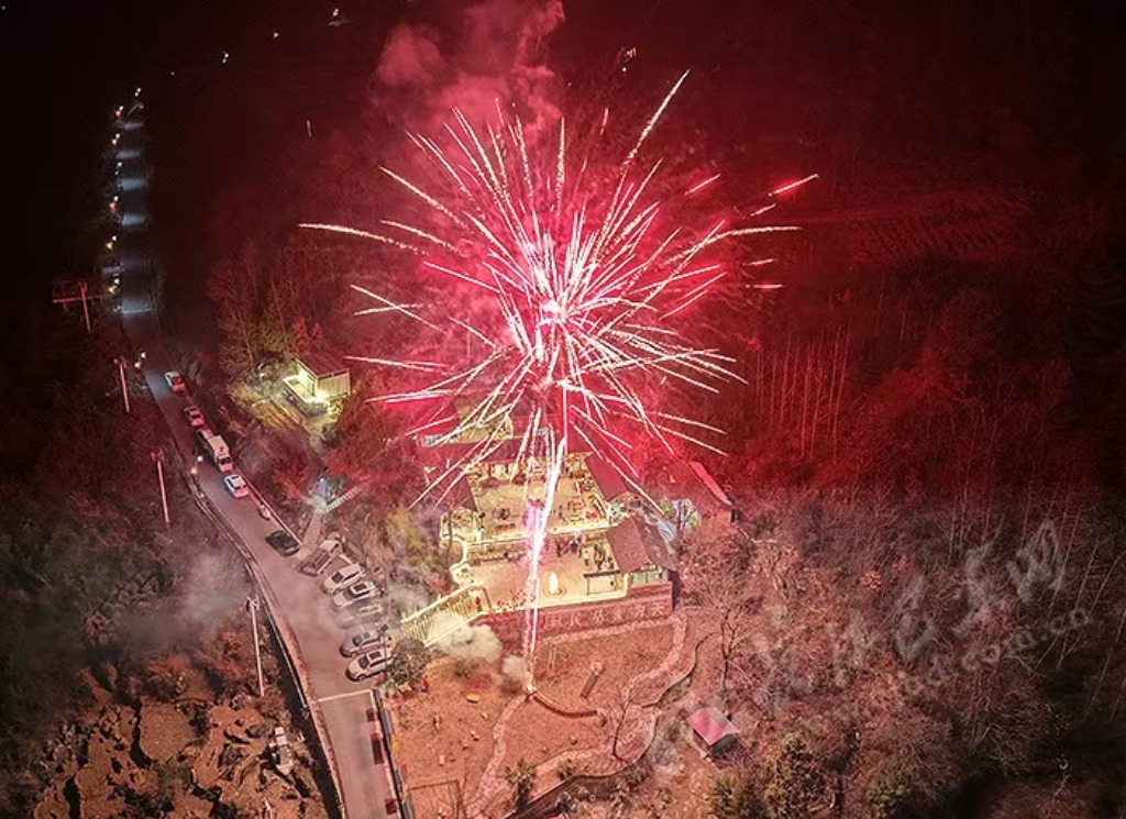 (饱尝刨汤美味后,游客与村民跳起欢快的土家摆手舞,观赏绚丽的烟花秀)