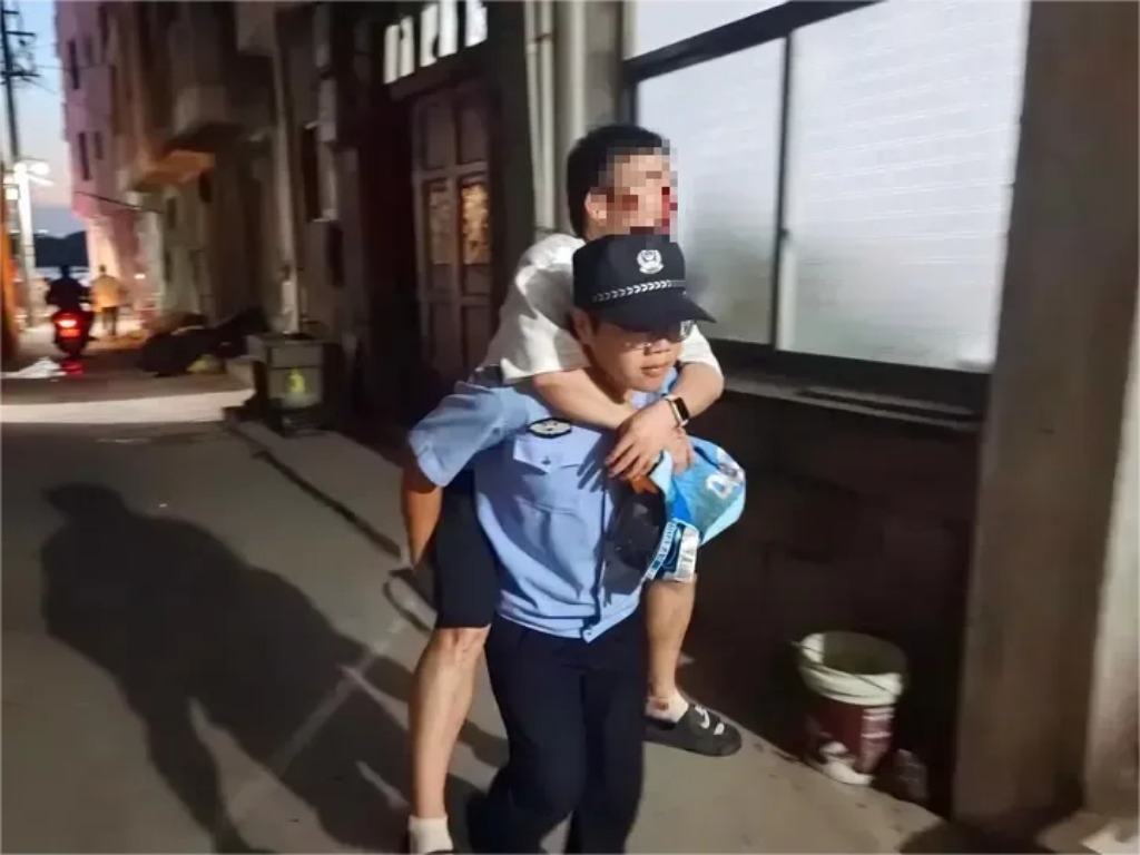 民警立即上前安抚游客情绪,并利用随车携带的急救包,迅速为伤者进行初步止血和消毒处理。鉴于游客伤势较为严重,民警决定立即将其送往卫生院。然而,在抵达卫生院附近时,因巷道狭窄,警车无法继续通行。“来,我背你!”辅警苏斌杰毫不犹豫地蹲下身,在同事的协助下将游客背起,一路小跑穿过石板路,以最快速度将其送至卫生院。