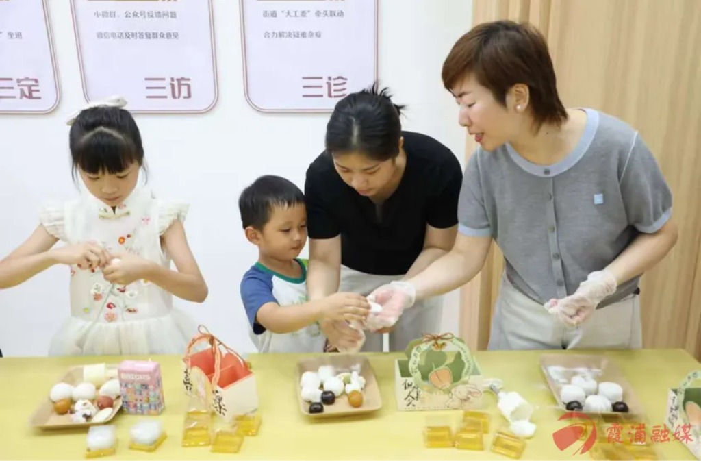 活动现场,社区工作人员提前备好面粉、馅料、模具等材料。居民们围坐在一起,揉面团、包馅料、压模具,动作从生疏到熟练,欢声笑语不断。一个个造型精致、印有“中秋”“国庆”字样的月饼在大家手中诞生。