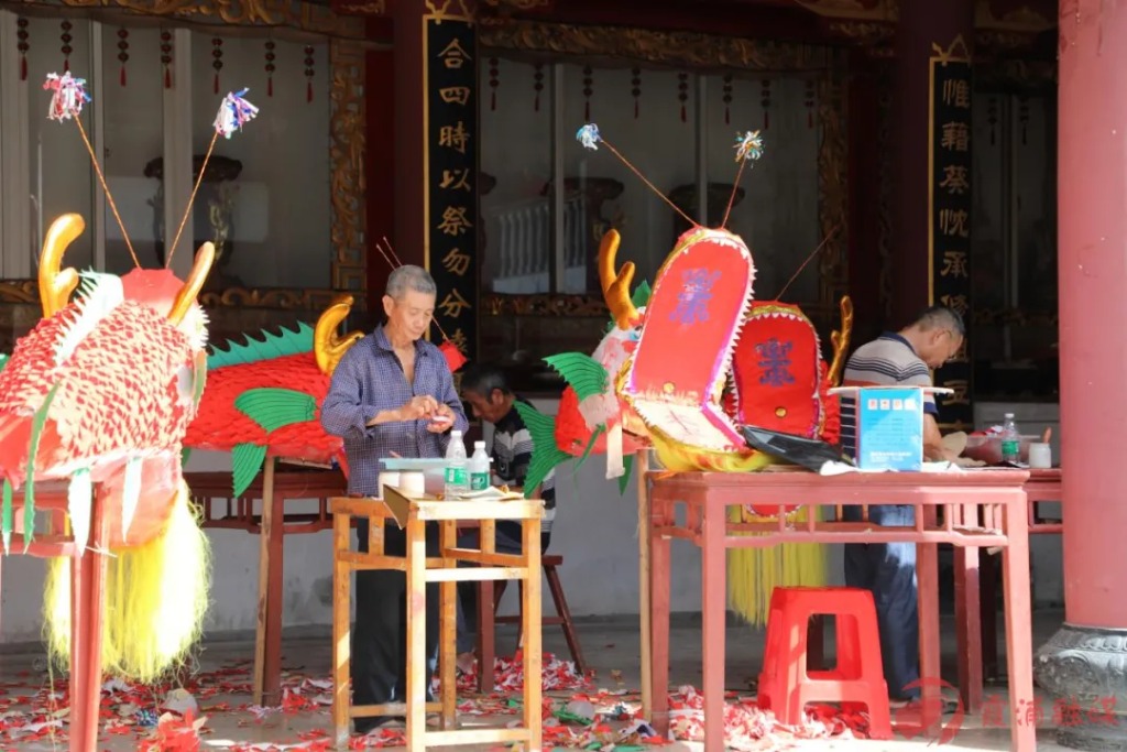 在浮山头自然村的制作现场,七八个初具雏形的鱼灯整齐摆放在桌面上,村民们分工协作,剪鱼鳞、粘贴、绑扎……一道道工序有条不紊地进行着。