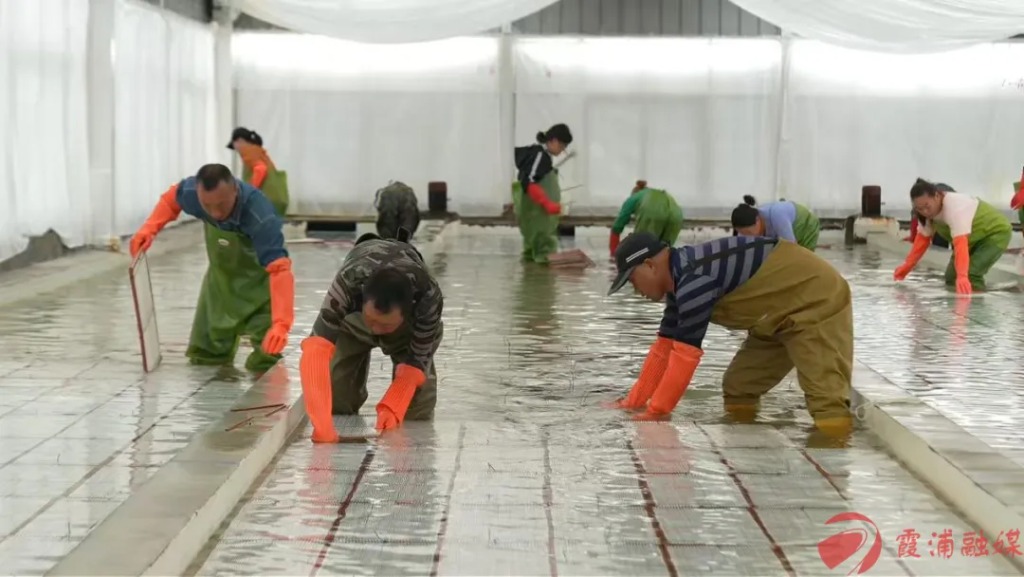 在霞浦县的一家海带育苗公司,育苗棚里内雾气缭绕,几十名工人正忙碌有序地操作,将一块块绑着白色绳索的育苗器整齐摆放入苗池中,现场一派繁忙景象。
