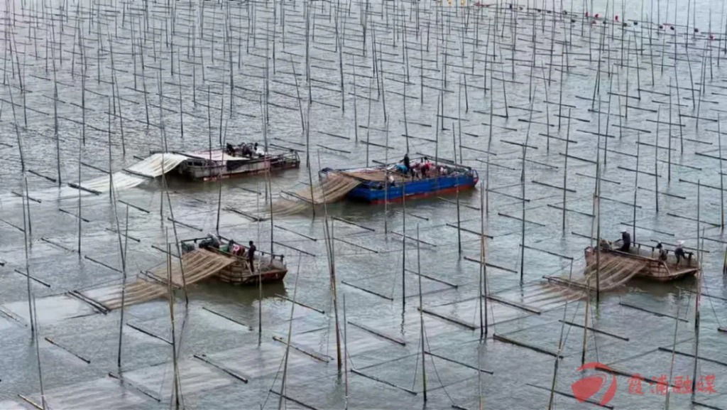 海面上,作业船来回穿梭,工人们将附有紫菜苗的养殖绳均匀捆扎在竹竿间,随着船只前行,绳索缓缓放入海水中,固定在网架之间,等待紫菜自然生长。