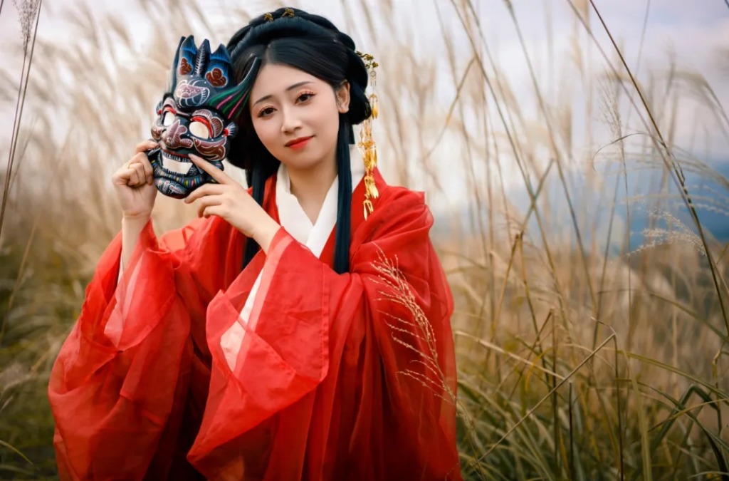 侧立于芦花丛中,手持道具,捕捉风吹发丝的动态瞬间,营造芦花绵延无际的视觉效果。