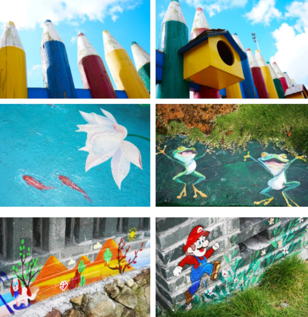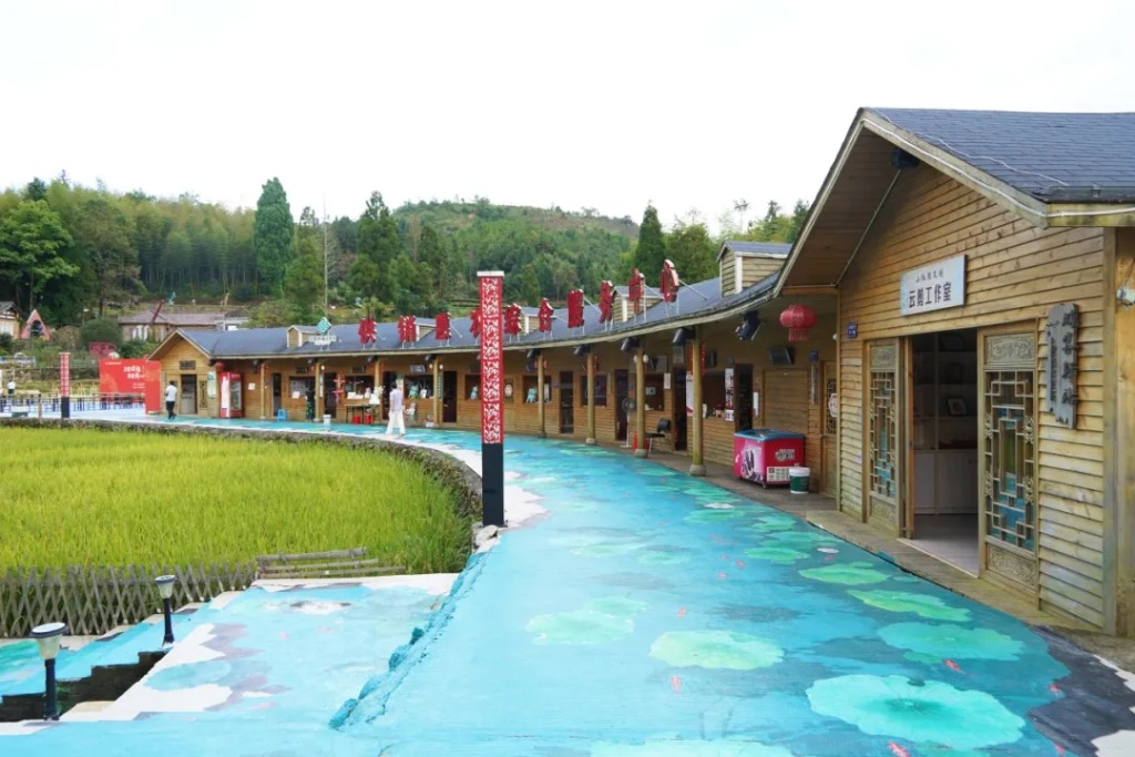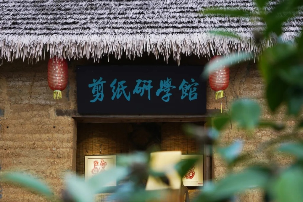 村子打造了充满艺术氛围的公共空间:彩色“铅笔”搭着原木小屋,石缝处被巧思描绘上彩图,就连地上也像从剪纸童话里搬来的场景,每一处线条、每一种色彩,都讲述着奇幻的故事。在占地5000平方米的文创田园里,剪纸传习馆、大师剪纸馆、红纸屋等文化空间错落分布,敞开怀抱迎接研学游客。