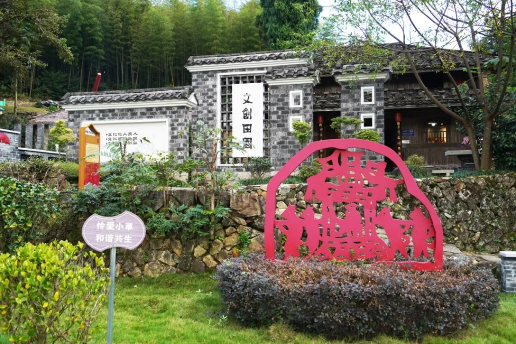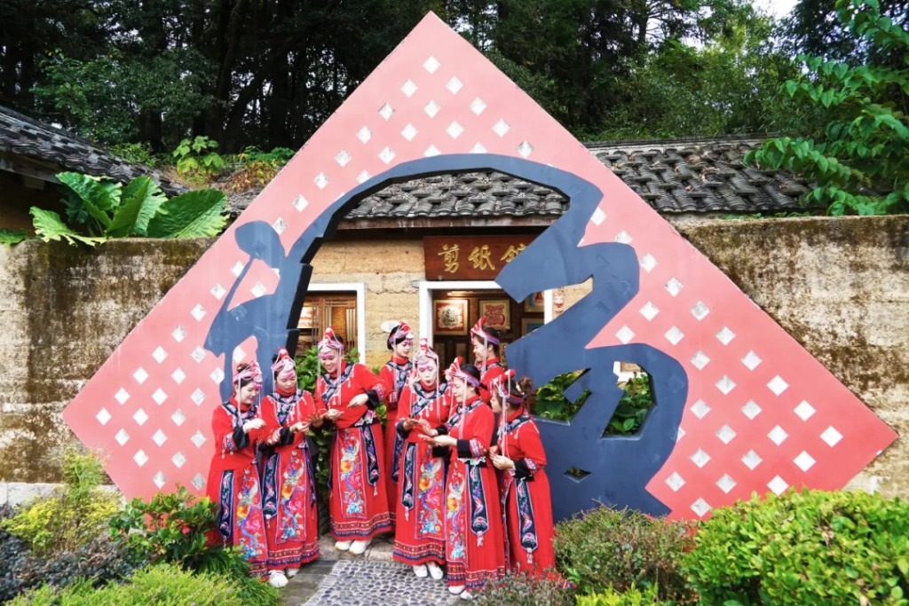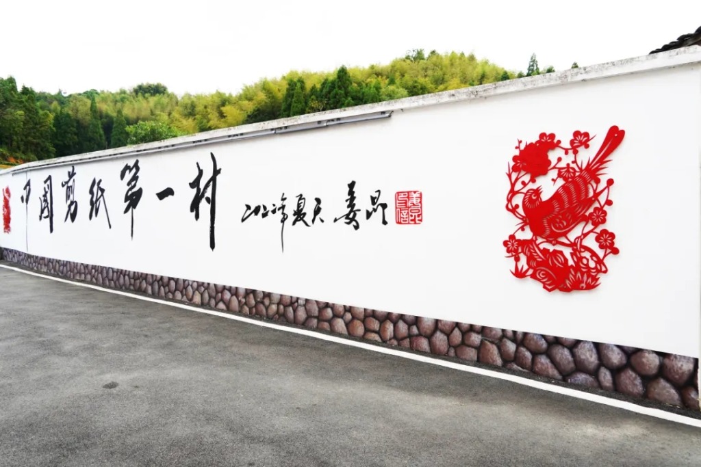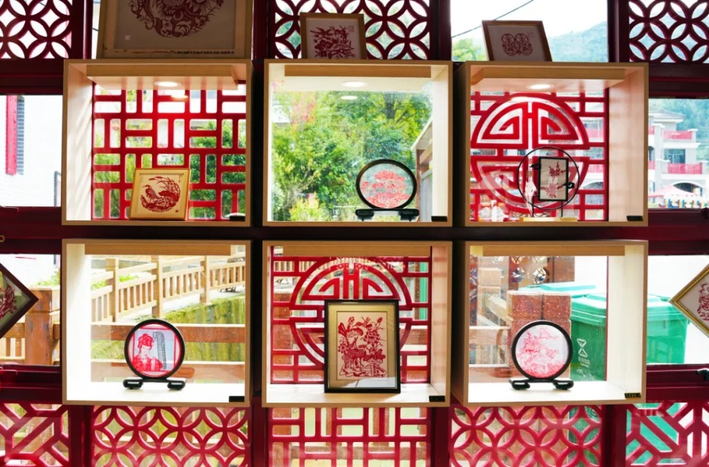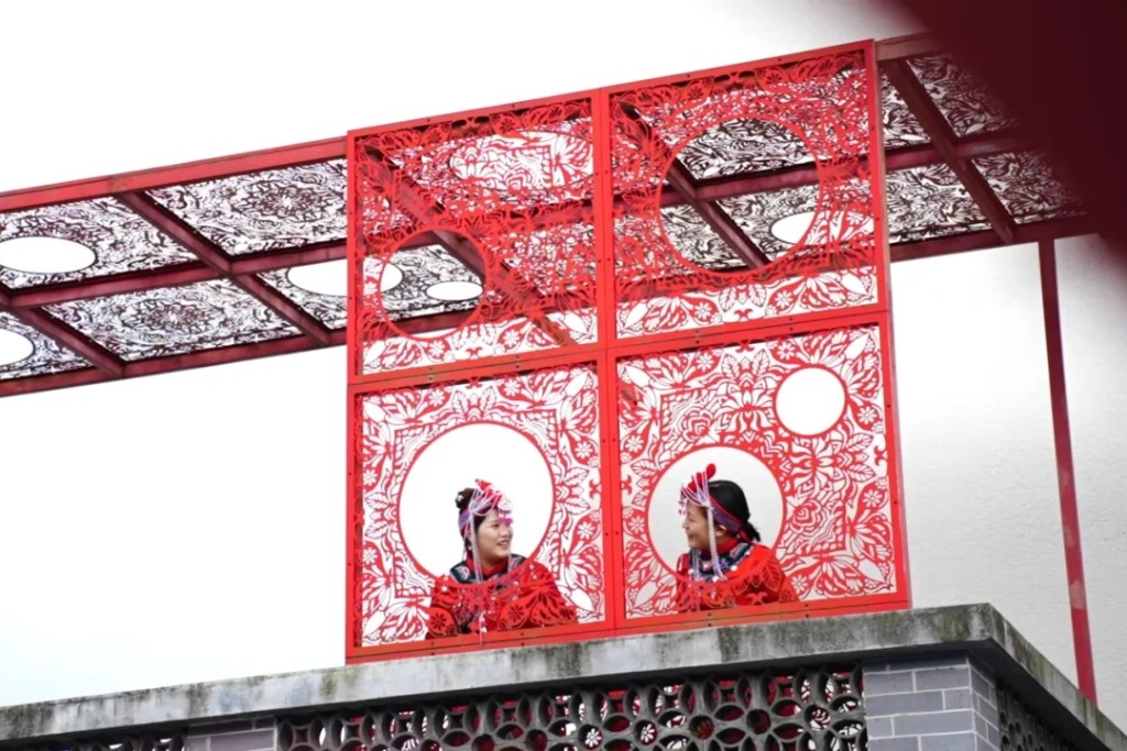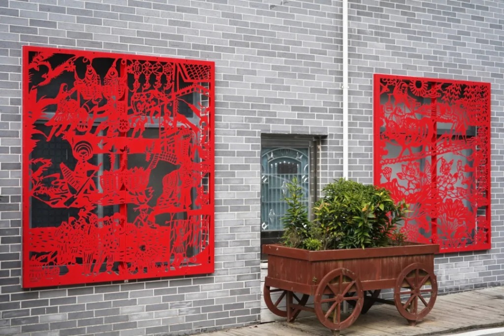 剪刀裁着时光,彩纸印着心事。走进村口,处处可见剪纸元素的巧妙融合。红色的剪纸造型装置,如灵动的艺术符号,与白墙黑瓦的民居相映成趣,传统与现代的美学在此碰撞交融。