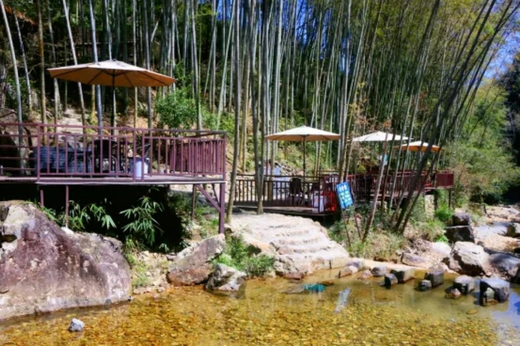 阳光透过竹林洒在水面上,