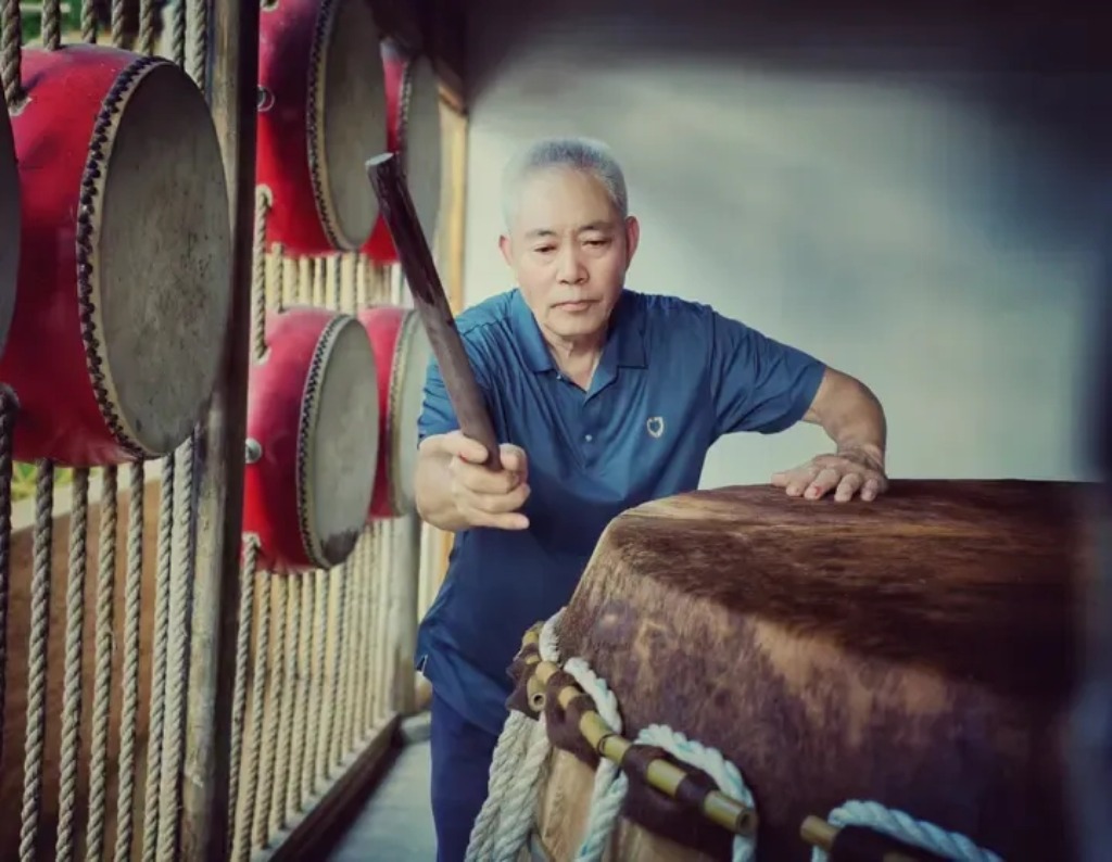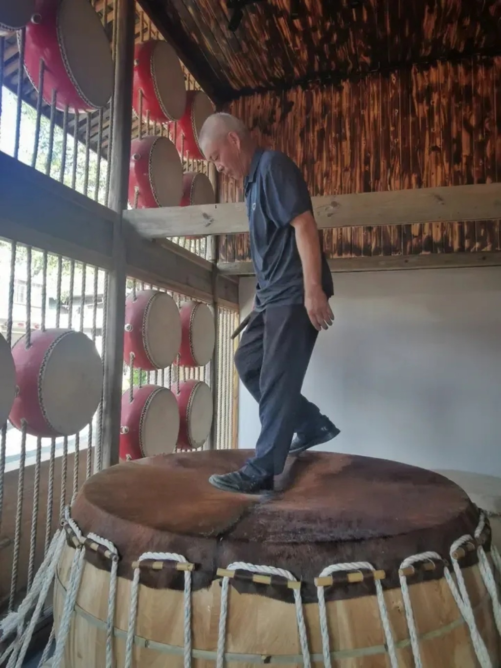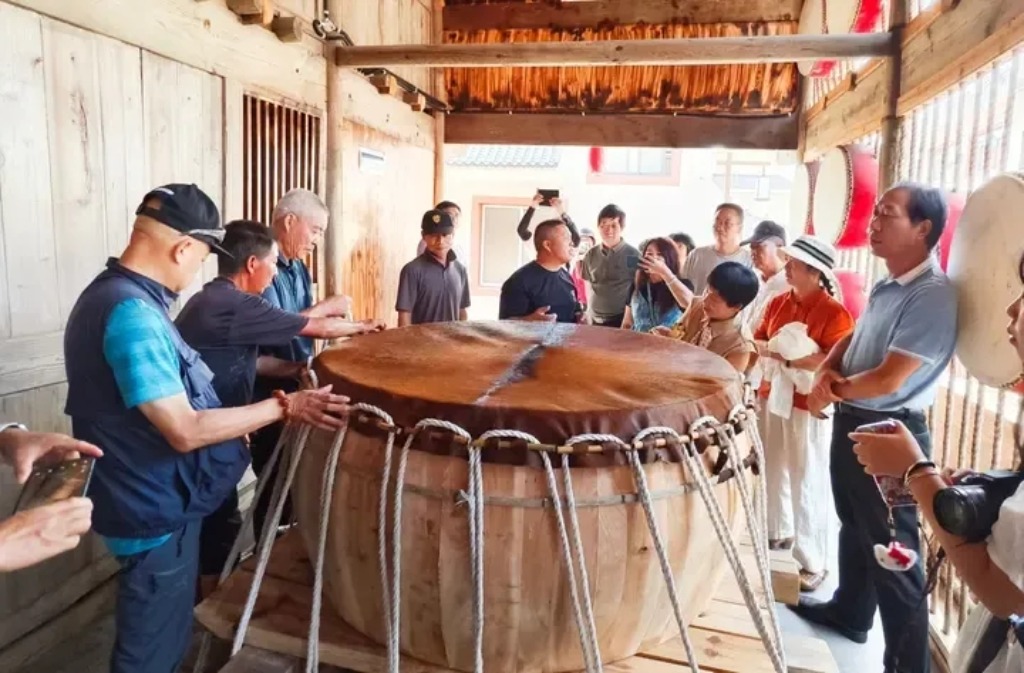 制鼓工匠在测试鼓面 郑承东 摄