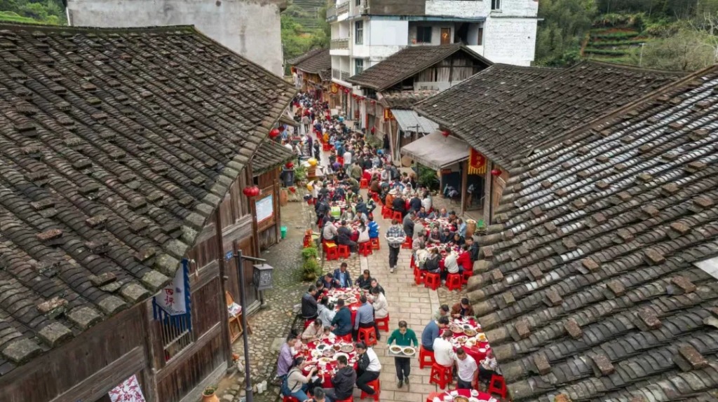 中午时分,在西坪村古街,“百家宴”依次排开,现场座无虚席,游客们围坐一堂,品尝以“状元文化”和宅中硒锌特色食材融合的状元琼宴,欢声笑语回荡在古街上,大家共同沉浸在这场充满文化气息的盛宴中。