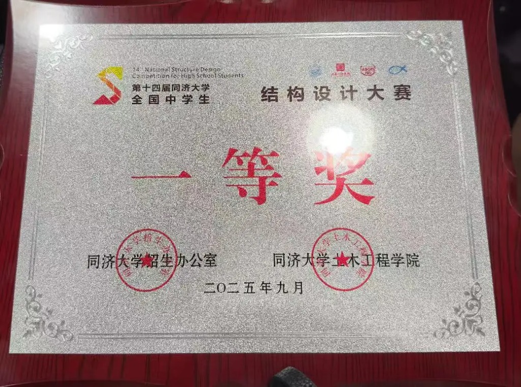 当我们的作品放在振动仪上撑住考验的瞬间,当我们手捧奖状的瞬间,所有的努力不是变成遗憾,而是蝶化成绽开的笑颜。我收获的不仅是一张证书,更是团队协作的温暖,从失败中迭代的坚韧,以及将创意落地的成就感。这座亲手搭建的“桥梁”,连向了我对未来的无限憧憬。感谢同济,让我们的结构之梦有了坚实的支点。感谢我校,让我们有良好的平台与资源来参加这收获满满的比赛。感谢黄玉霞老师和吴正麟老师,他们的细心教导才让我们得以光荣地站上领奖台!