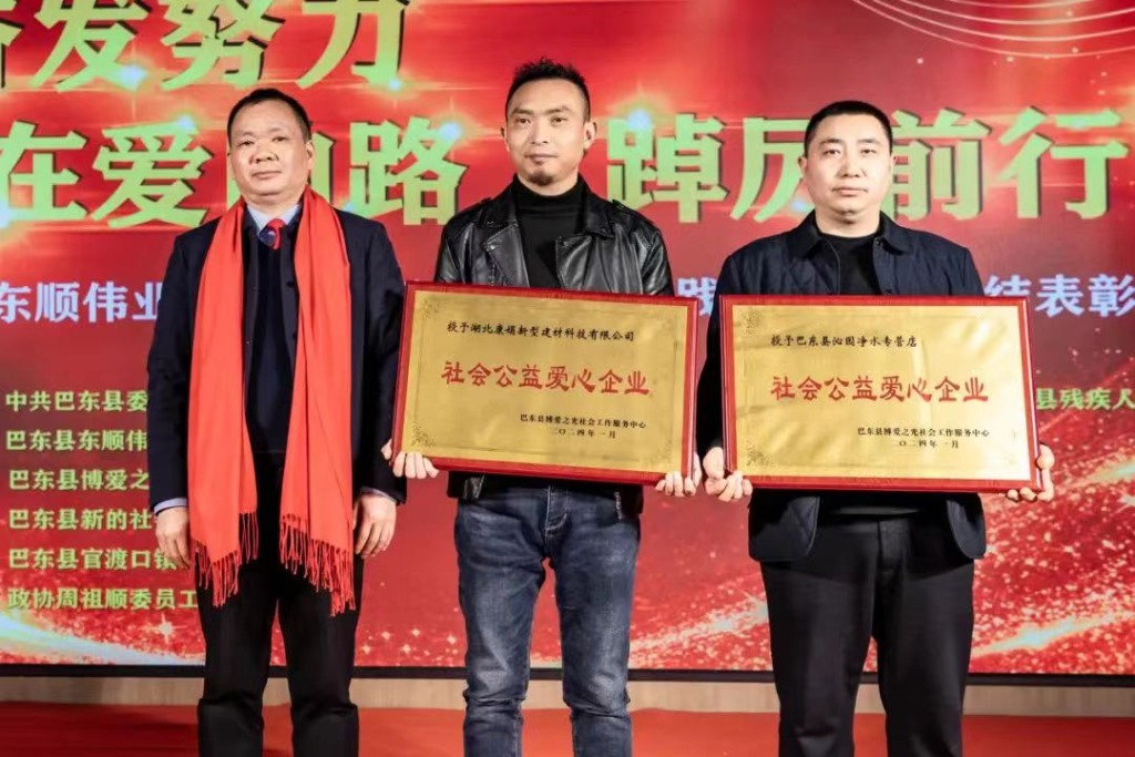 为进一步加强感情联络,促进今后的工作,东顺伟业总经理、博爱之光理事长周祖顺,为“巴东沁园净水专营店、湖北康娟新型建材科技有限公司”两家爱心企业友情授牌。
