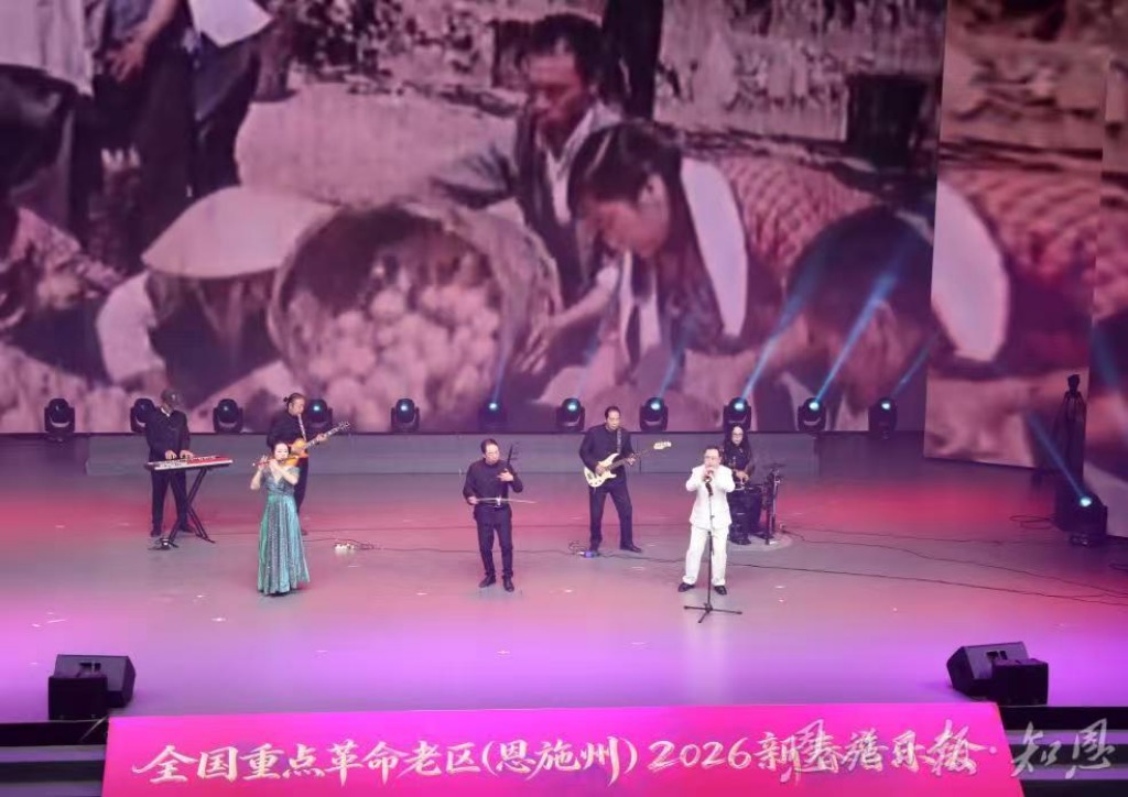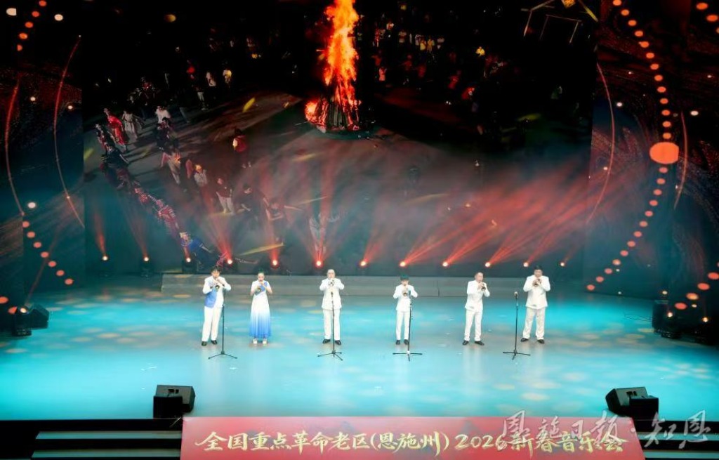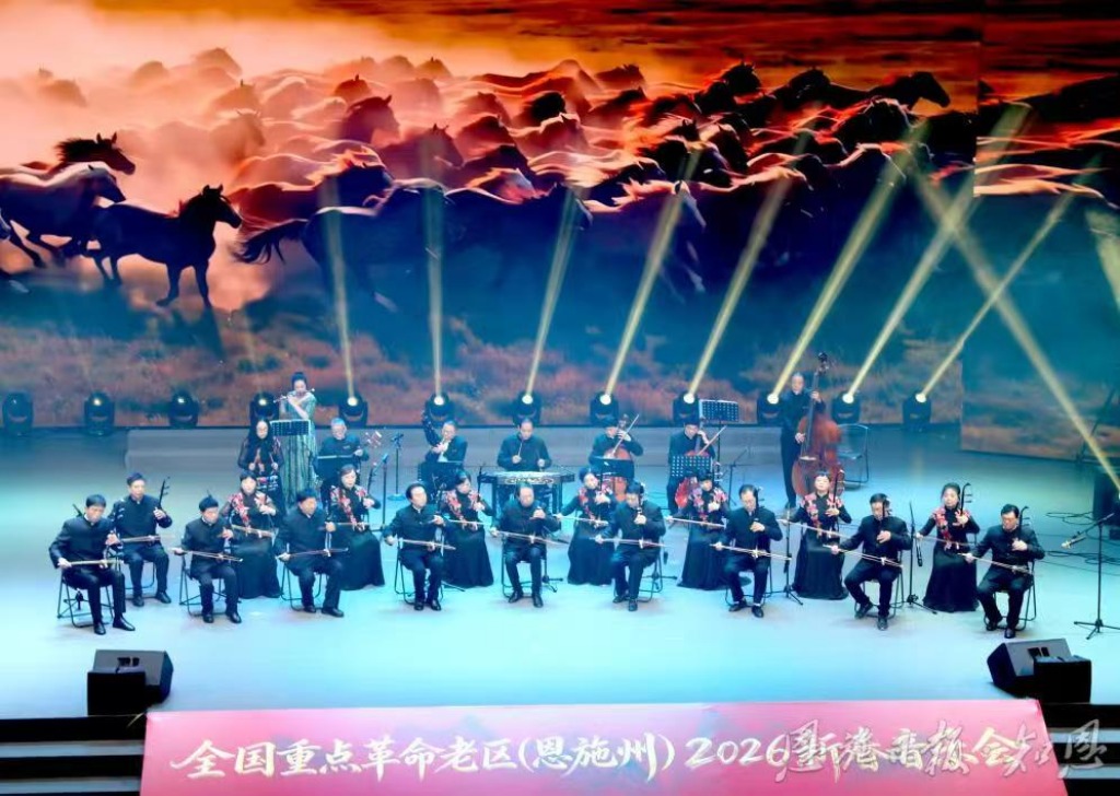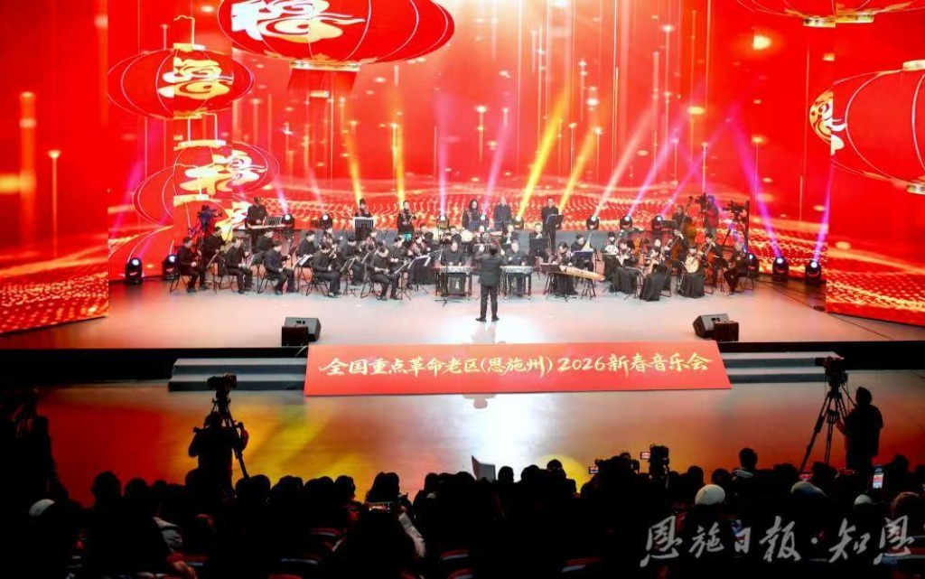 2026年1月6日,全国重点革命老区湖北省恩施自治州广播电视台大型演播厅内乐声激昂、掌声雷动。为赓续红色血脉、弘扬老区精神,提升恩施作为全国重点革命老区的知名度与影响力,由恩施自治州革命老区建设促进会、州融媒体中心联合主办,州文化馆与州民族乐团承办的全国重点革命老区恩施自治州2026年新春音乐会在此举行。