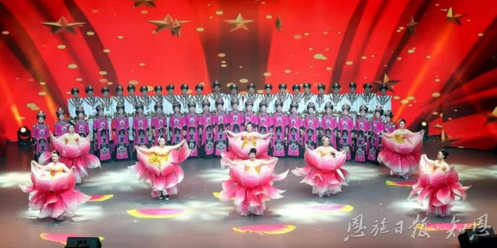 红色民族文化的魅力在演出中愈发浓郁。湖北艺术节“楚天群星奖”得主阿惹阿美组合,以一曲《摘朵栀子花》惊艳全场,她们甜美的声线与创新改编的民歌风格,展现了恩施民族文化的鲜活生命力;二胡齐奏《奔驰在千里草原》则以激昂旋律演绎国乐经典,传递出奋发向上的精神力量。当歌伴舞《中国啊中国》的旋律响起,全场观众起立合唱,嘹亮的歌声震彻演播厅,将晚会气氛推向高潮。