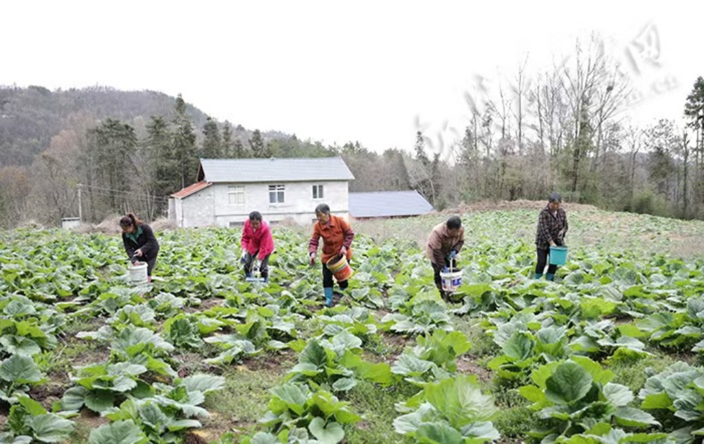 时下,一畦畦翠绿的马蹄大黄长势喜人,鲜嫩的叶片层层叠叠,工人们抢抓农时,为马蹄大黄施肥,为药材的增产增收打下基础。