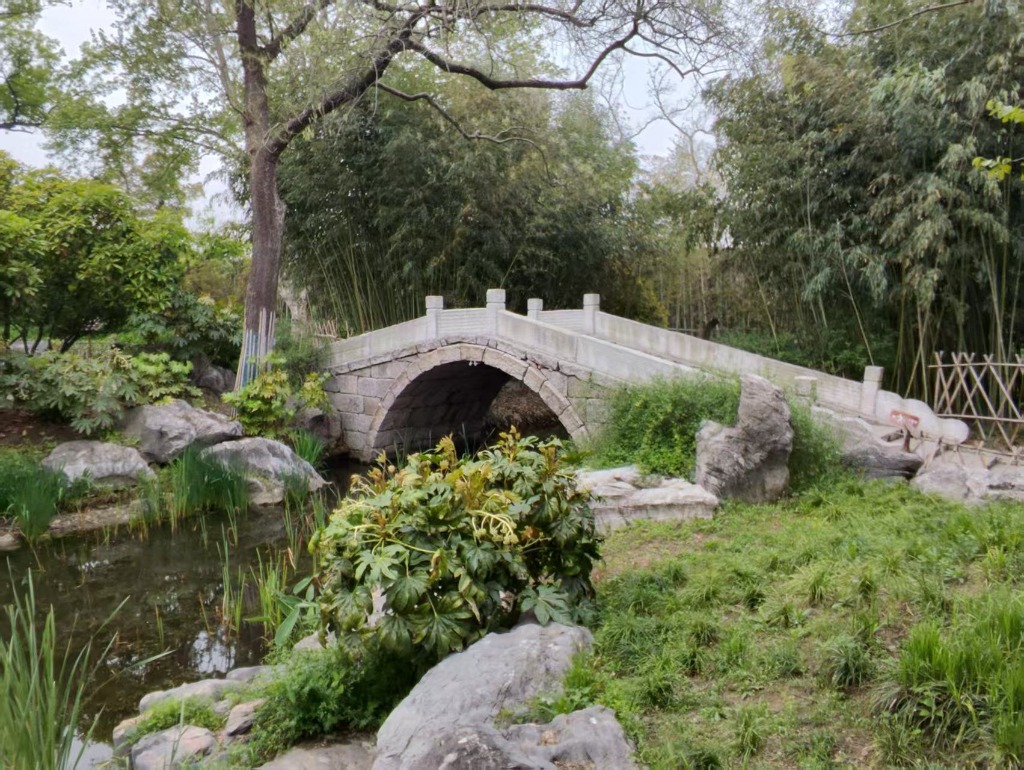 在新建的植物园附近的长廊里,油然而生地想起了我的诗友石娟的一首《淮畔春景》诗:杨柳蛮腰戏碧烟,呢喃燕子绕房檐。水波荡漾浮萍动,几片荷钱随浪翻。