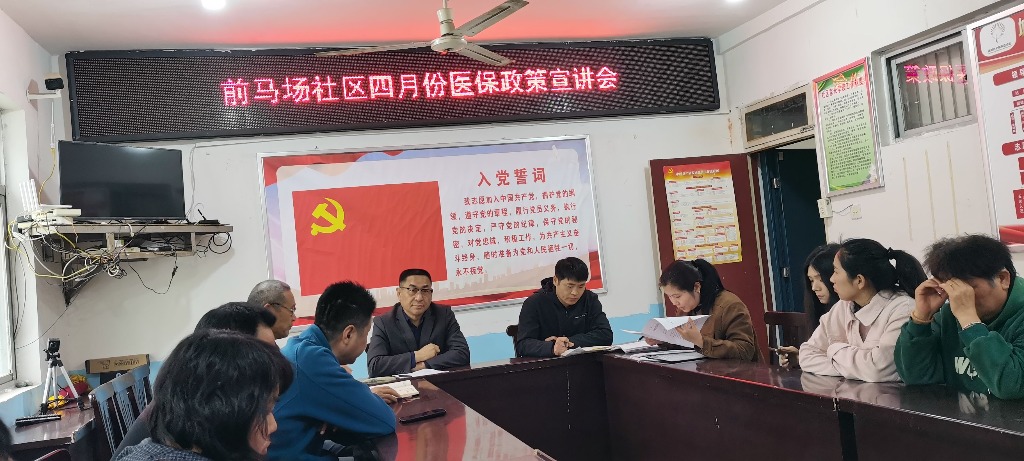 本网讯(通讯员 胡依玥 胡仲昌)4月15日,凤台县城关镇前马场社区组织社区全体工作人员,在社区四楼会议室,召开四月份医保政策宣讲会,并要求各网格信息员走进各辖区,向辖区居民,重点是行动不便的老年人宣传2026年医保新政策。