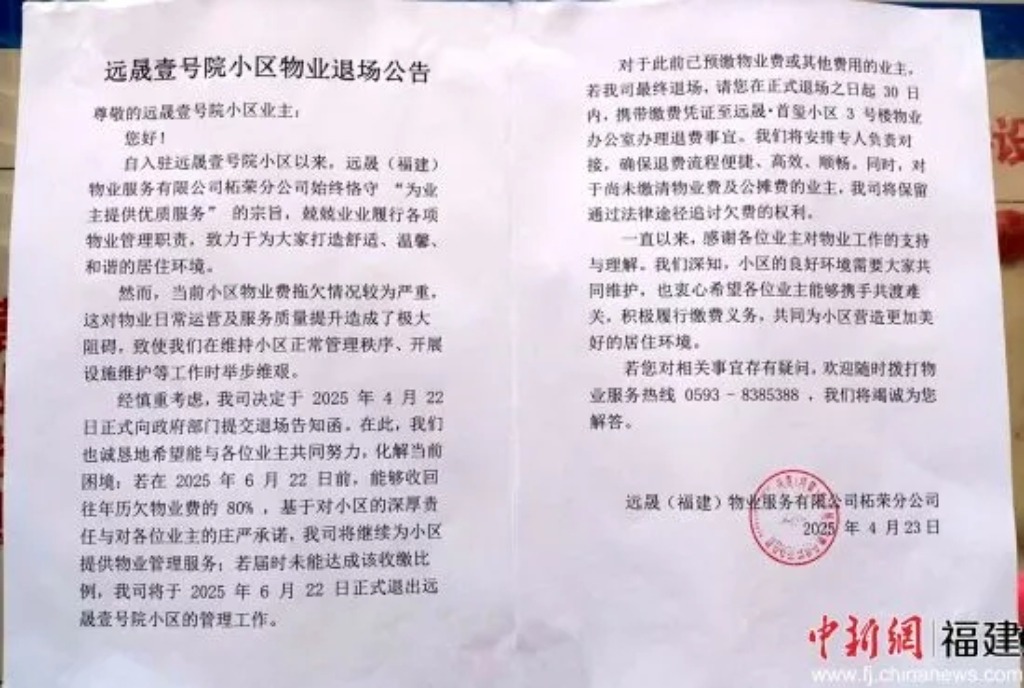 今年6月,福建省柘荣县远晟壹号院小区因原物业公司合同到期撤场,一度陷入电梯运行保障断层、公摊费用收缴停滞、小区公共垃圾无人清理等困境,近600户居民生活受到严重影响。