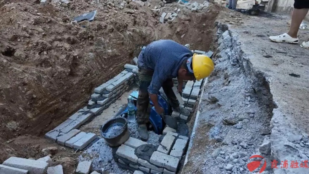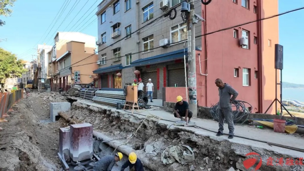 施工现场,工人们正在切割钢管,铺设地下管道,用砖块和砂浆砌筑排水设施。三沙镇区沿线到处是火热的施工场景。